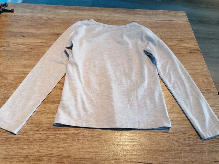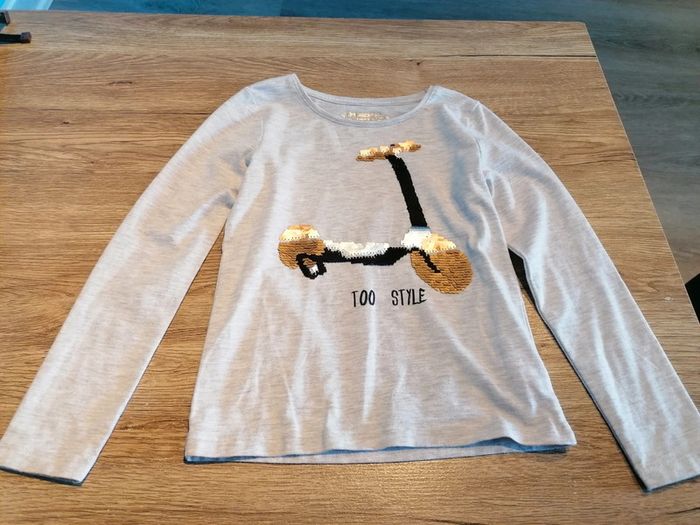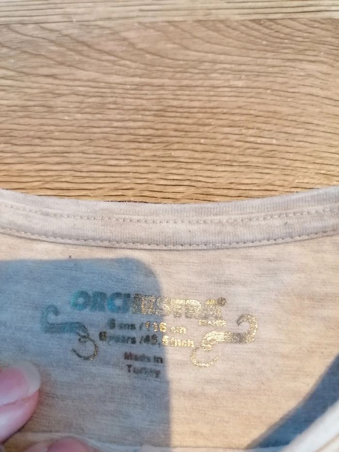 Bonjour, je vends ce tee shirt à manches longues beige motif trotinette à sequins de la marque Orchestra taille 6ans en très bon état. Lavé maison non fumeur.