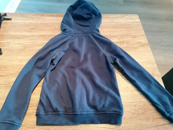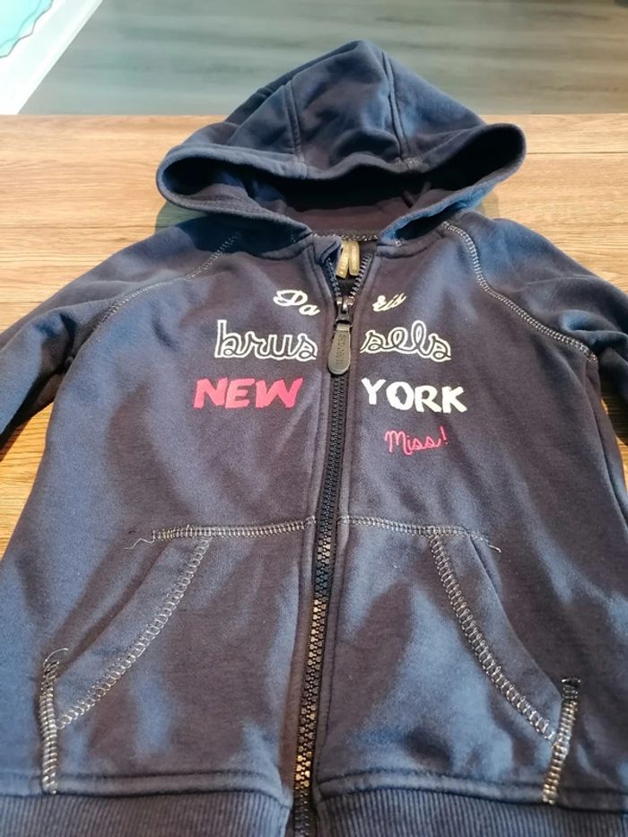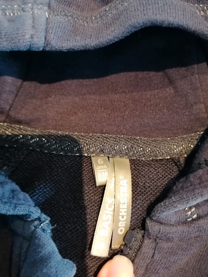 Bonjour, je vends ce gilet à capuche bleu marine avec inscriptions de la marque Orchestra taille 6ans en très bon état. Lavé maison non fumeur.