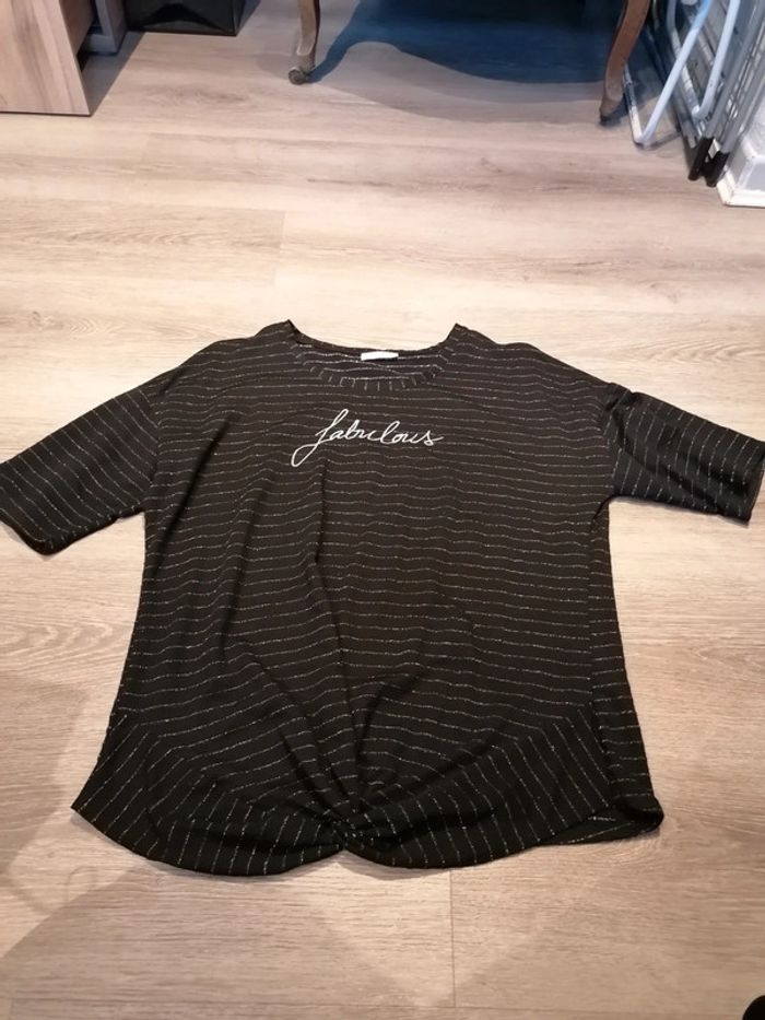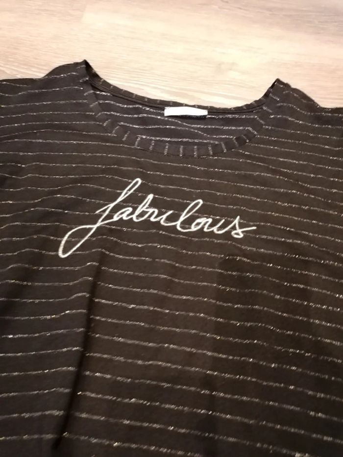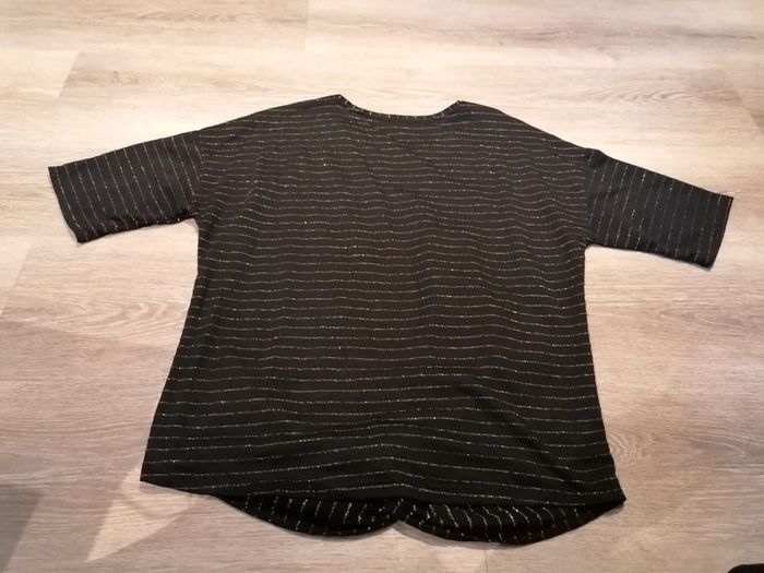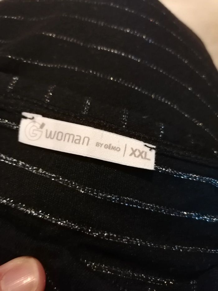 Bonjour, je vends ce tee shirt à manches courtes noir rayé argenté de la marque Gémo taille XXL en très bon état. Lavé maison non fumeur.
