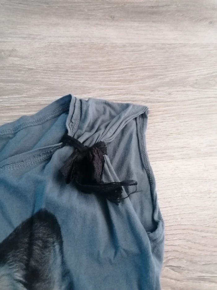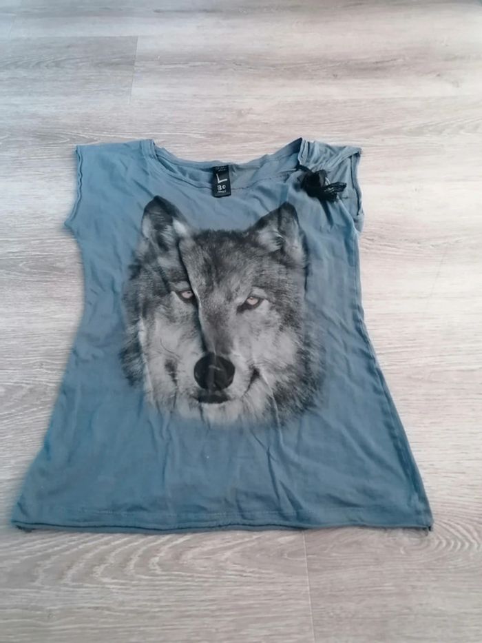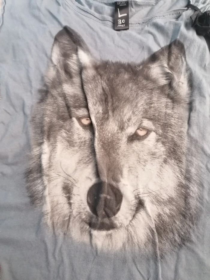 Bonjour, je vends ce tee ce tee shirt à manches courtes gris motif loup de la marque Bershka taille L en très bon état. Lavé maison non fumeur.