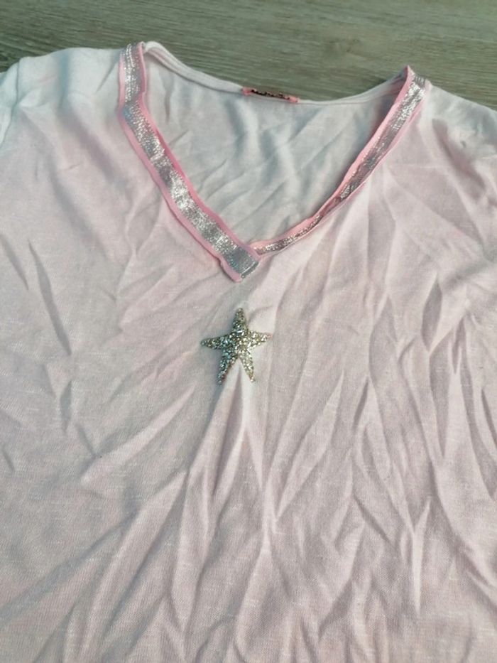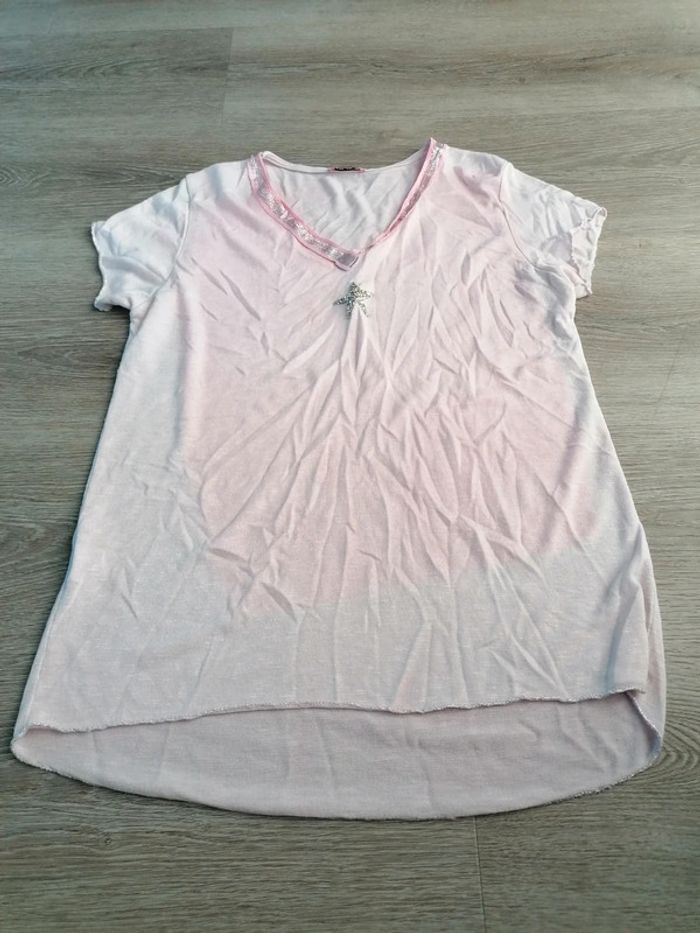 Bonjour, je vends ce tee shirt à manches courtes rose de la marque Made In Italy taille 42 en bon état. Lavé maison non fumeur.