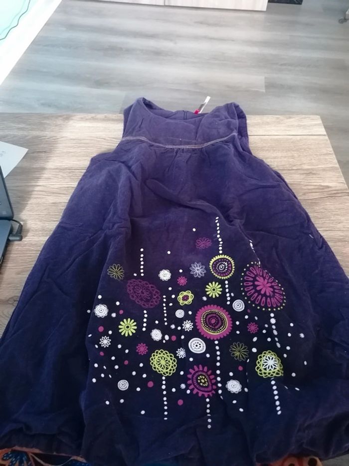 Bonjour, je vends cette robe sans manches en velours violette de la marque Orchestra taille 10ans en très bon état. Élastique 3n bas. Lavé maison non fumeur.