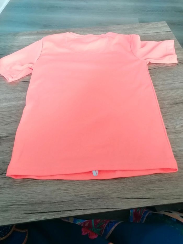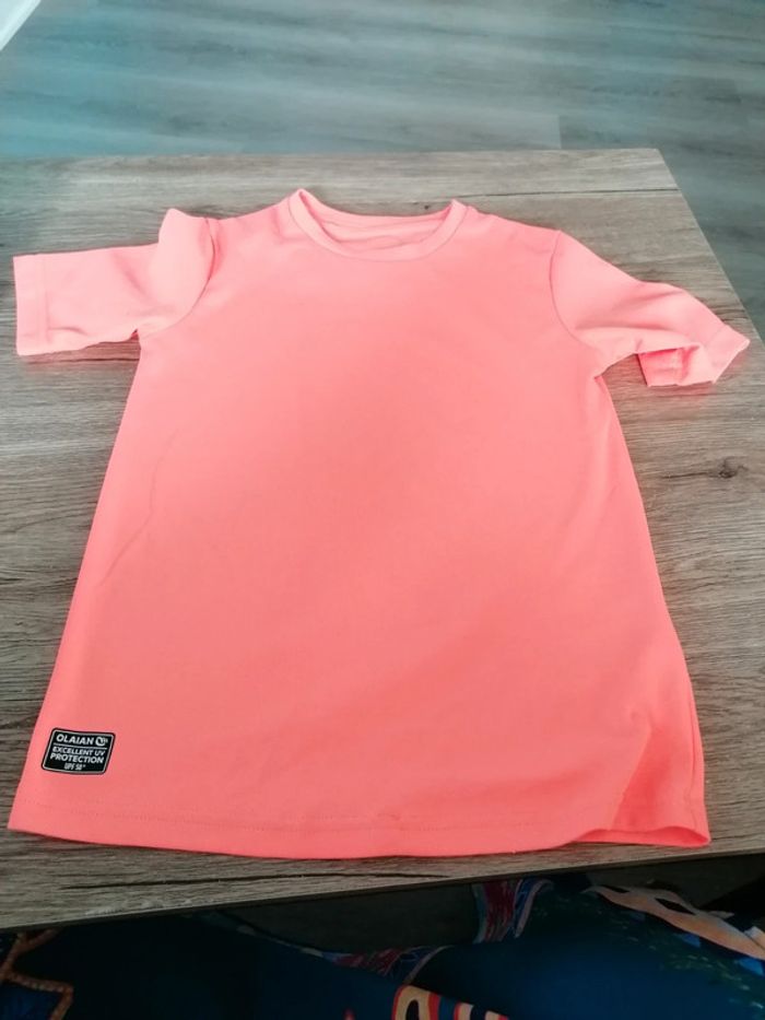 Bonjour, je vends ce tee shirt à manches courtes corail de la marque décathlon protection UV taille 8ans en très bon état. Lavé maison non fumeur.