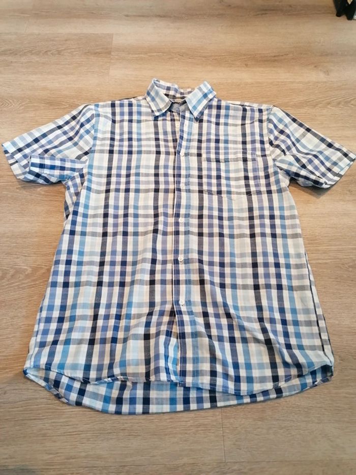 Bonjour, je vends cette chemise à manches courtes à carreaux bleue et blanche de la marque Damart taille M en très bon état. Lavé maison non fumeur.