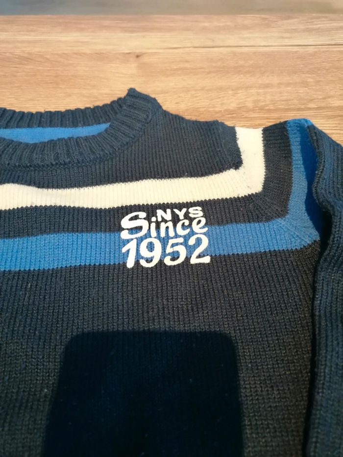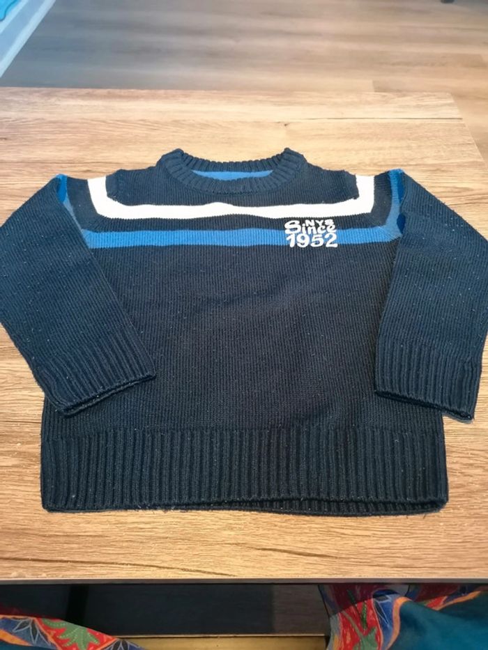 Bonjour, je vends ce pull marine et banc de la marque C&A taille 36mois en très bon état. Lavé maison non fumeur.