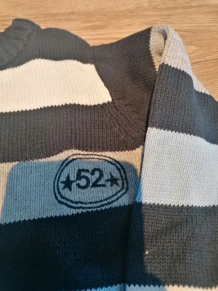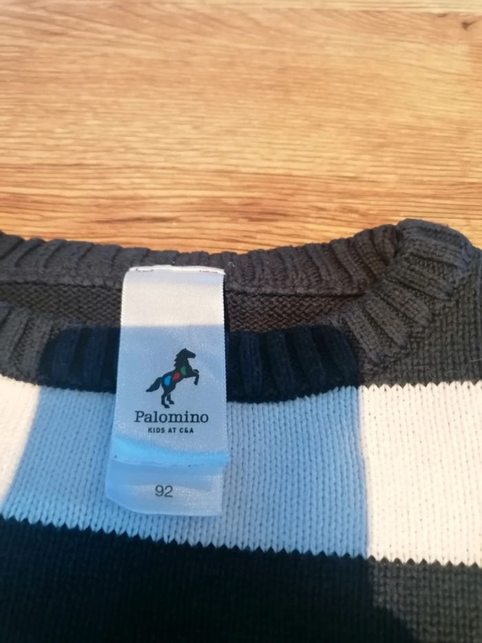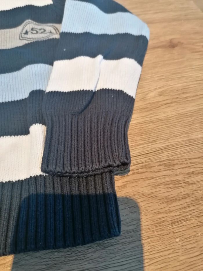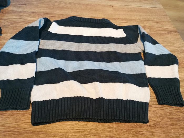 Bonjour, je vends ce pull rayé noir gris blanc et bleu de la marque C&A taille 36mois en très bon état. Lavé maison non fumeur.