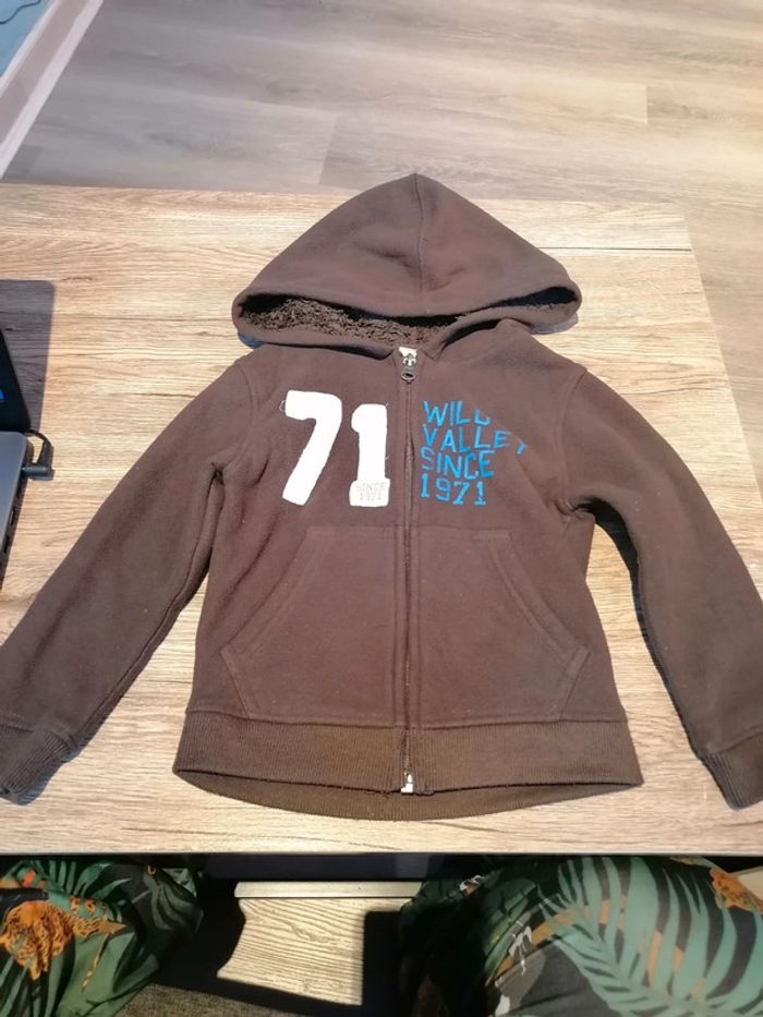 Bonjour, je vends ce gilet à capuche marron de la marque Palomino taille 4ans en très bon état. Lavé maison non fumeur.