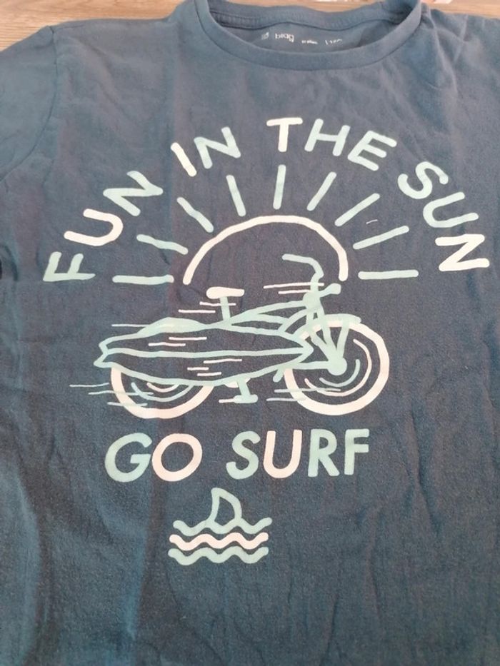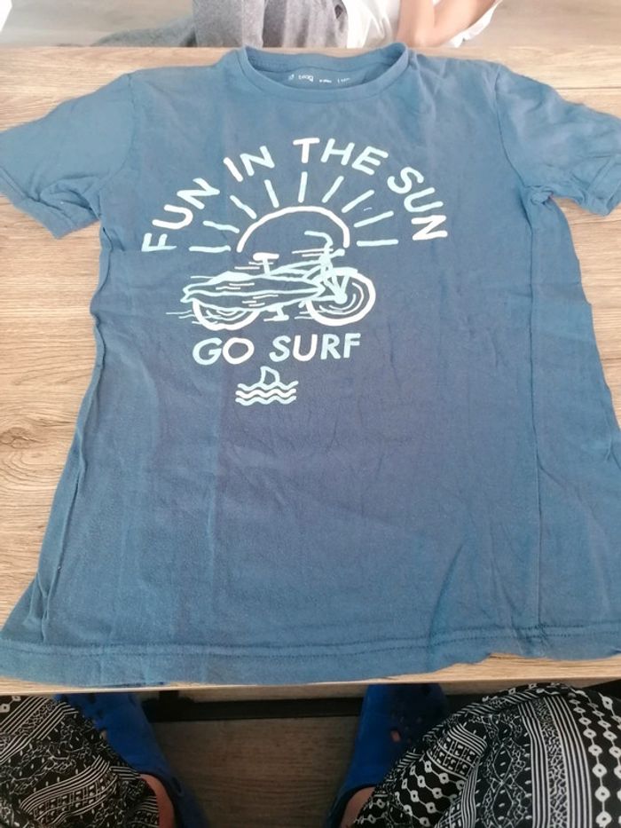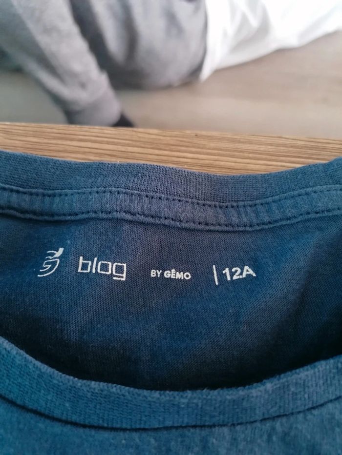 Bonjour, je vends ce tee shirt à manches courtes bleu de la marque Gémo taille 12ans en très bon état. Lavé maison non fumeur.
