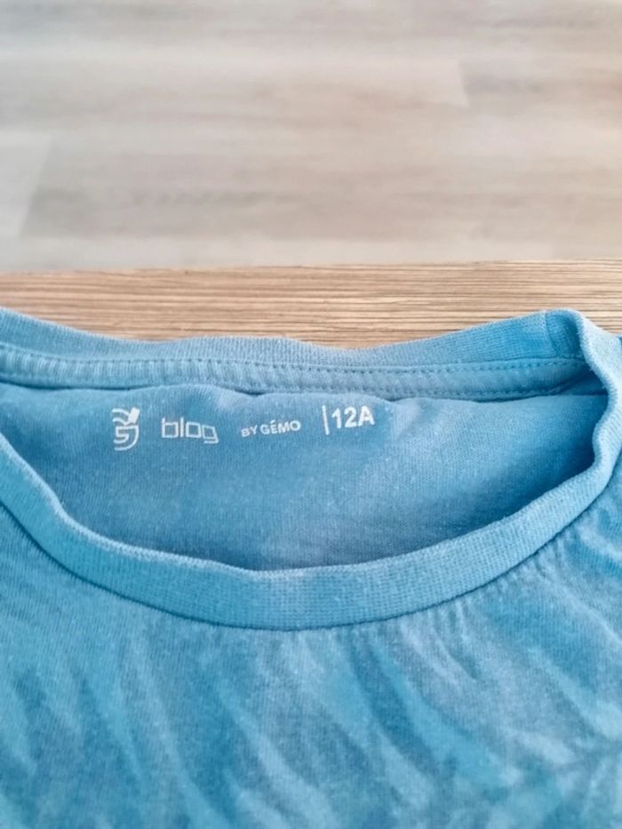 Bonjour, je vends ce tee shirt bleu de la marque Gémo taille 12ans en très bon état. Lavé maison non fumeur.