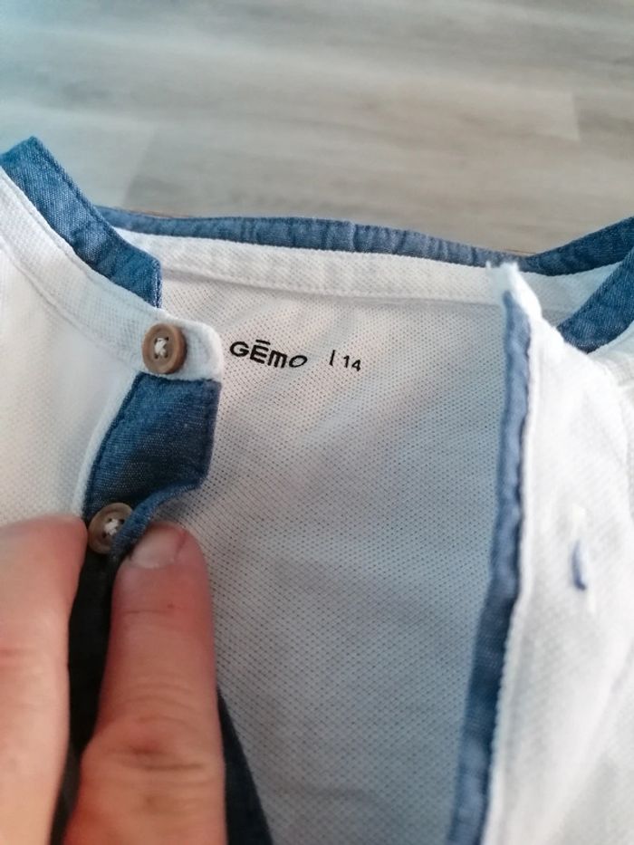 Bonjour, je vends ce tee shirt à manches courtes blanc et bleu de la marque Gémo taille 14ans en très bon état. Lavé maison non fumeur.