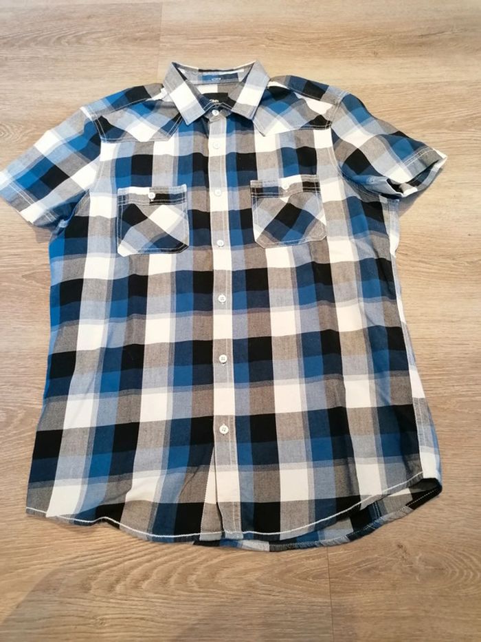Bonjour, je vends cette chemise à manches courtes à carreaux marine, noire et blanche de la marque C&A taille M en très bon état. Lavé maison non fumeur.