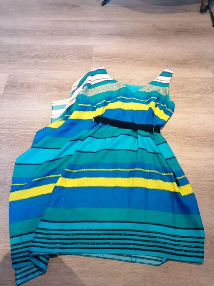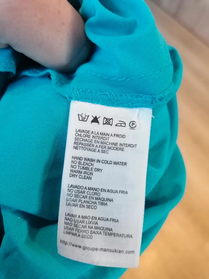 Bonjour, je vends cette robe asymétrique dans les tons de bleu/vert de la marque manoukian vendue avec ceinture taille XS en très bon état. Lavé maison non fumeur.