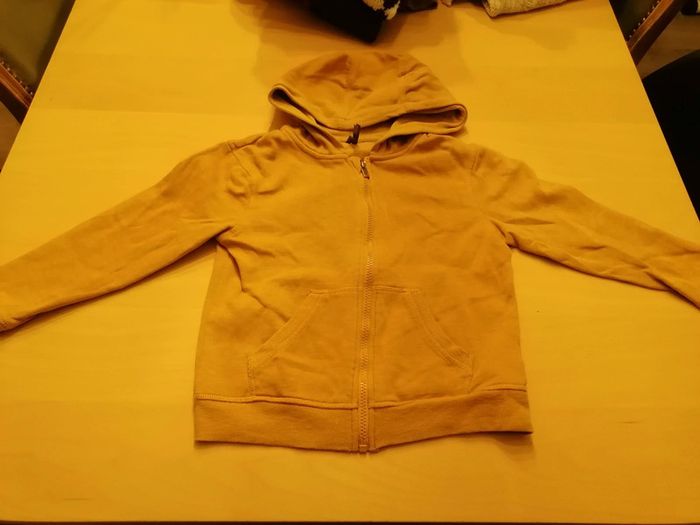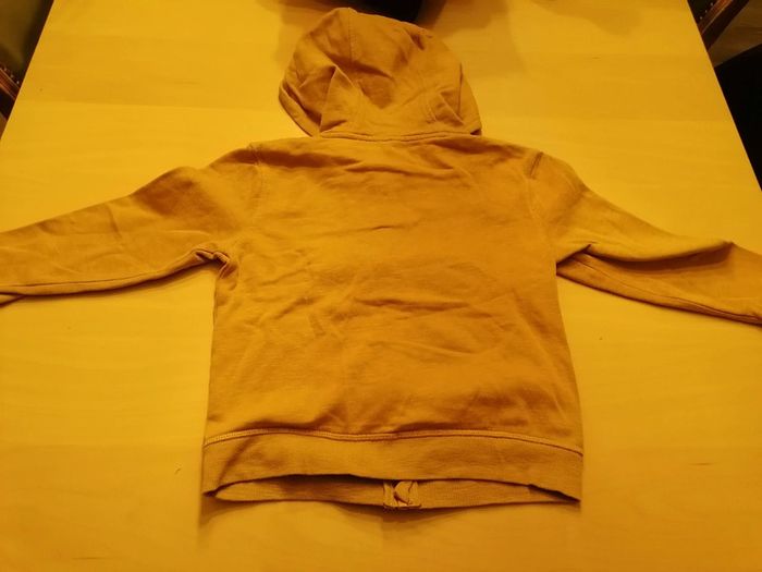 Bonjour, je vends ce gilet à capuche moutarde de la marque Orchestra taille 8ans en très bon état. Lavé maison non fumeur.