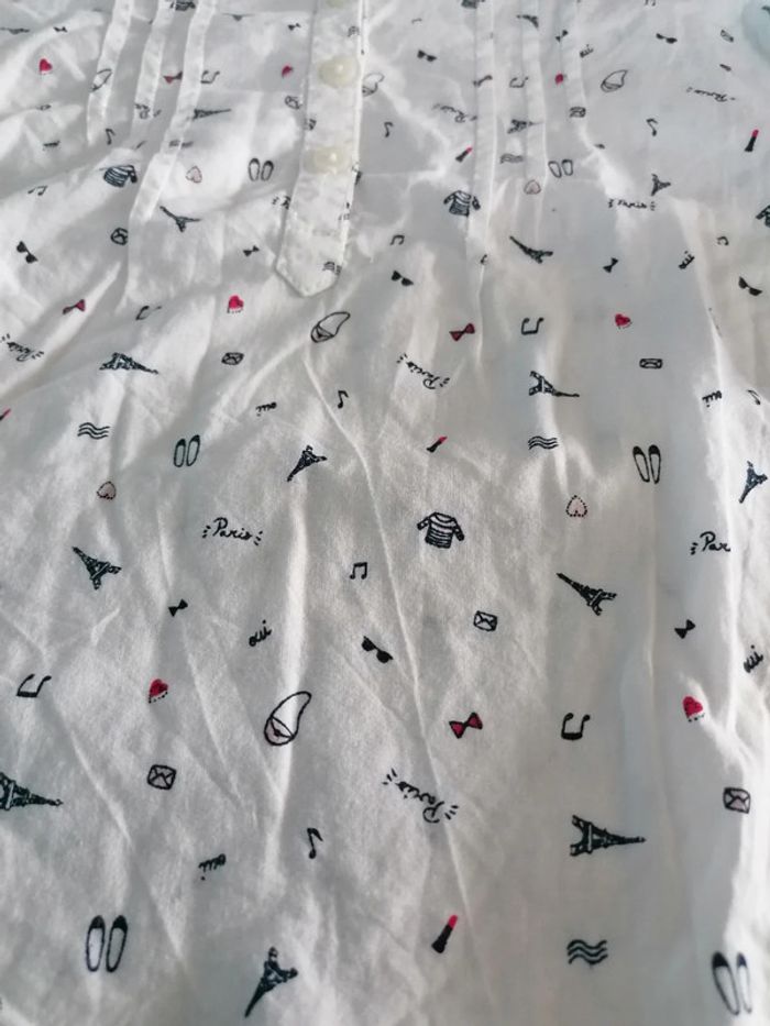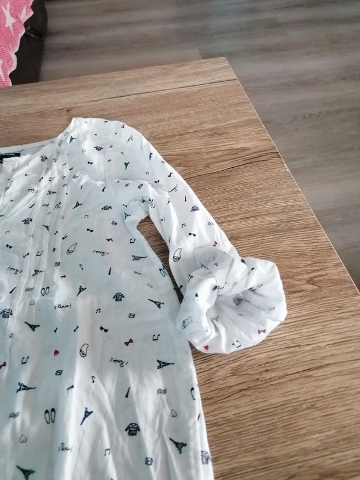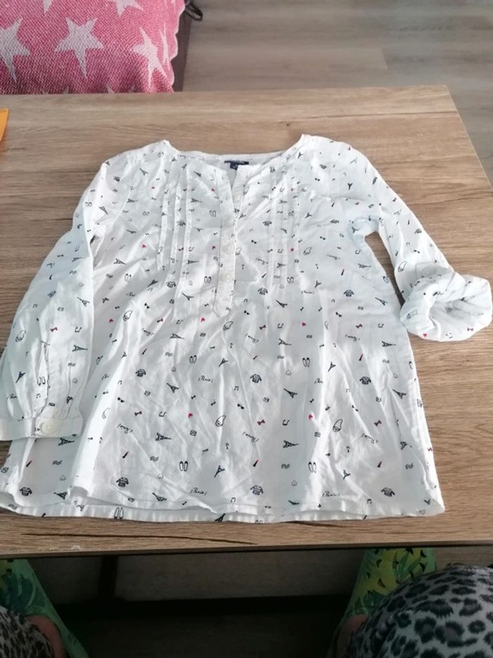 Bonjour, je vends ce tee shirt à manches longues dont les manches peuvent de relever blanc motifs bleu marine et rouge en très bon état. Lavé maison non fumeur.