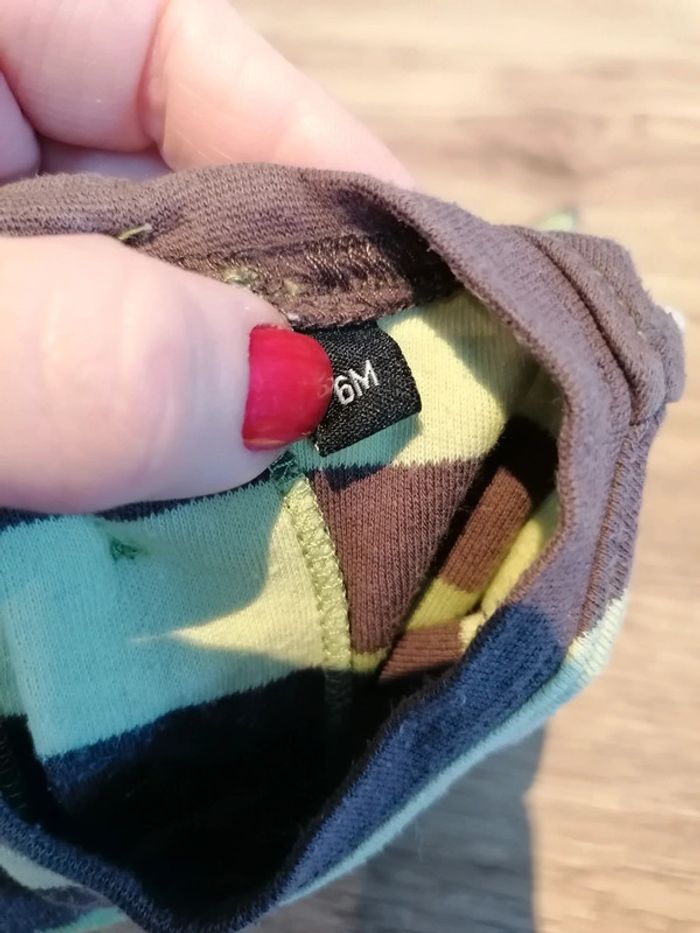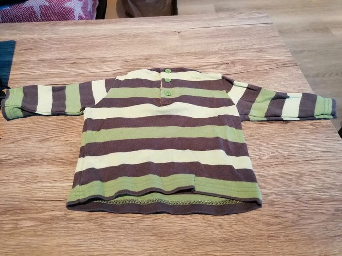 Bonjour, je vends ce tee shirt à manches longues rayé vert et marron taille 6mois en très bon état. Lavé maison non fumeur.