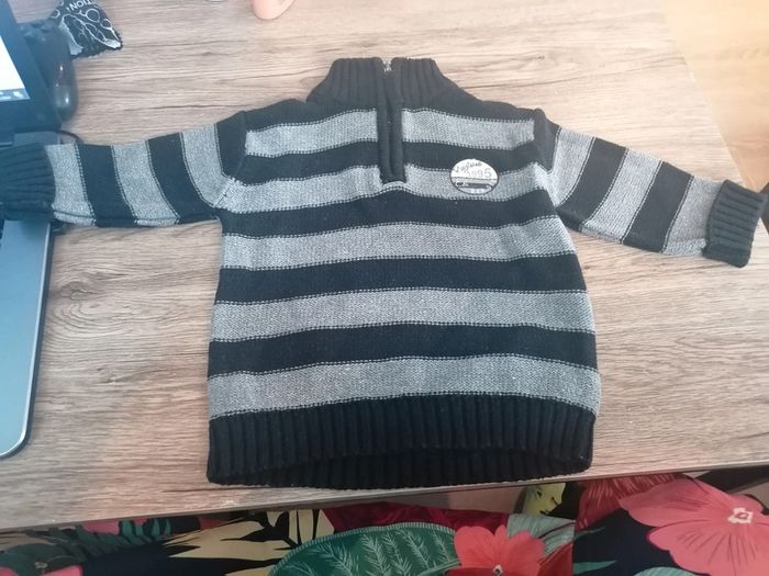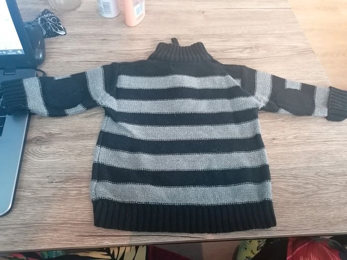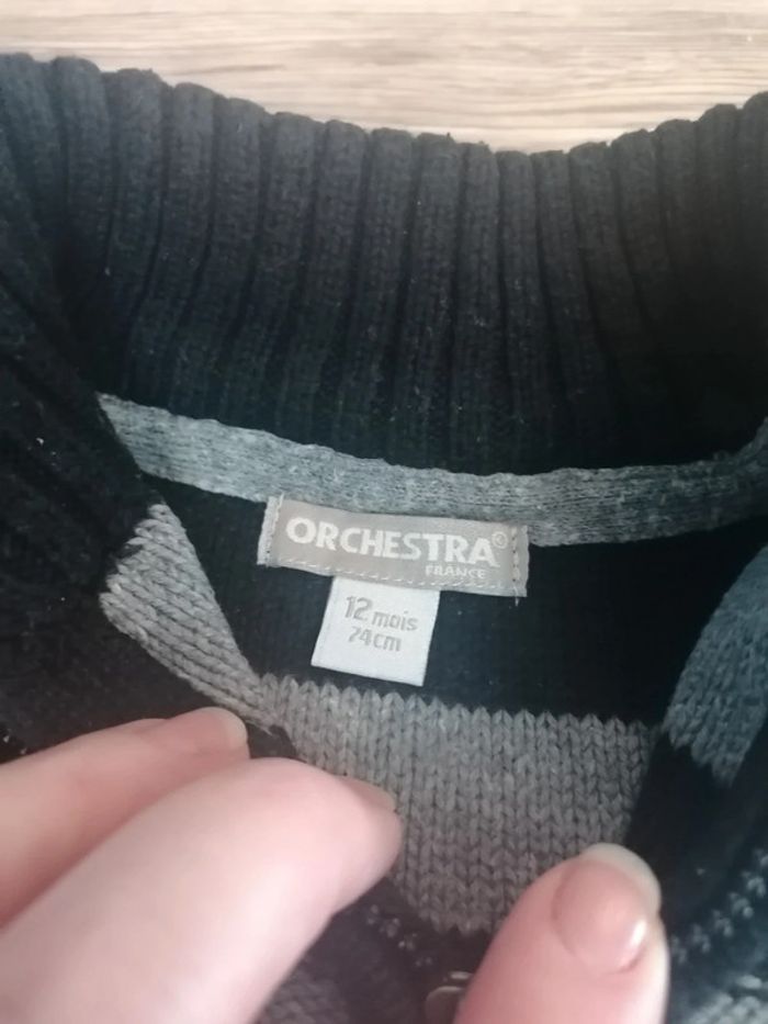 Bonjour, je vends ce pull rayé noir et gris col montant de la marque Orchestra taille 12mois. En très bon état. Lavé maison non fumeur.