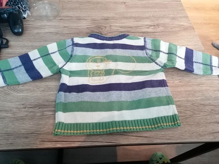 Bonjour, je vends ce gilet rayé violet, blanc et vert de la marque Sergent major taille 12mois en bon état (quelques peluches). Lavé maison non fumeur.
