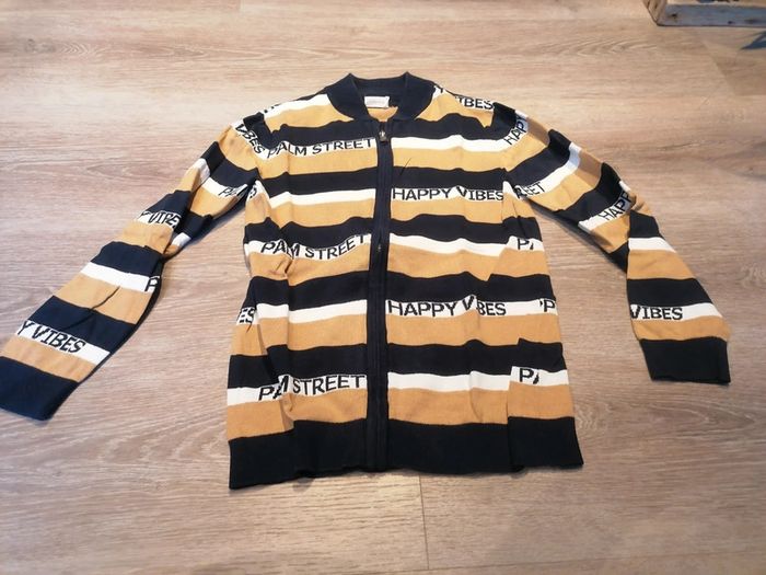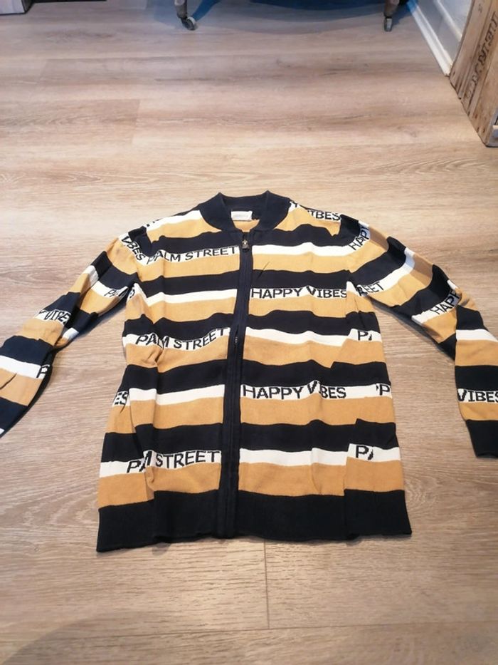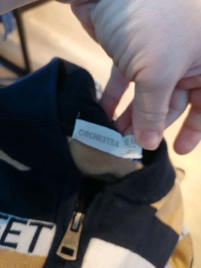 Bonjour, je vends ce gilet beige, blanc et bleu marine de la marque Orchestra taille 12ans en très bon état. Lavé maison non fumeur.