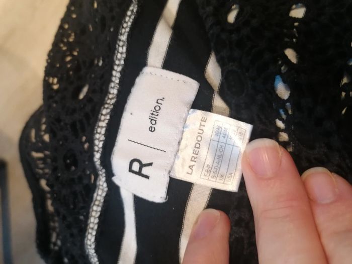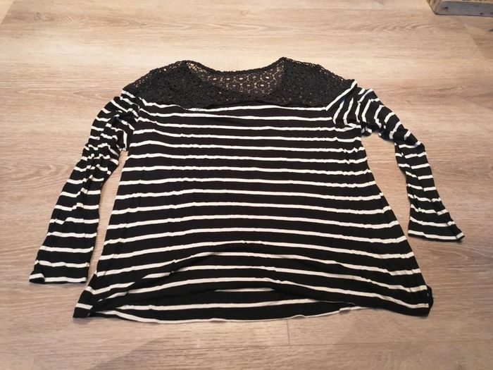 Bonjour, je vends ce tee shirt manches 3/4 rayé noir et blanc avec dentelle sur le haut en parfait état. Taille 46/48. Lavé maison non fumeur.
