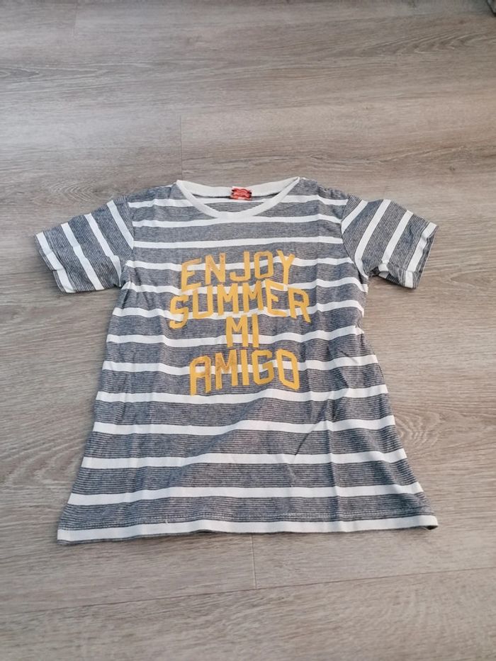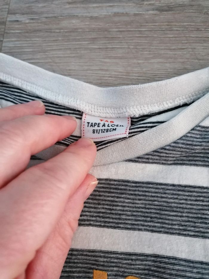 Bonjour, je vends ce tee shirt à manches courtes rayé noir et blanc de la marque Tape à l'œil taille 8ans en très bon état. Lavé maison non fumeur.
