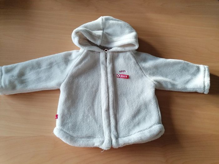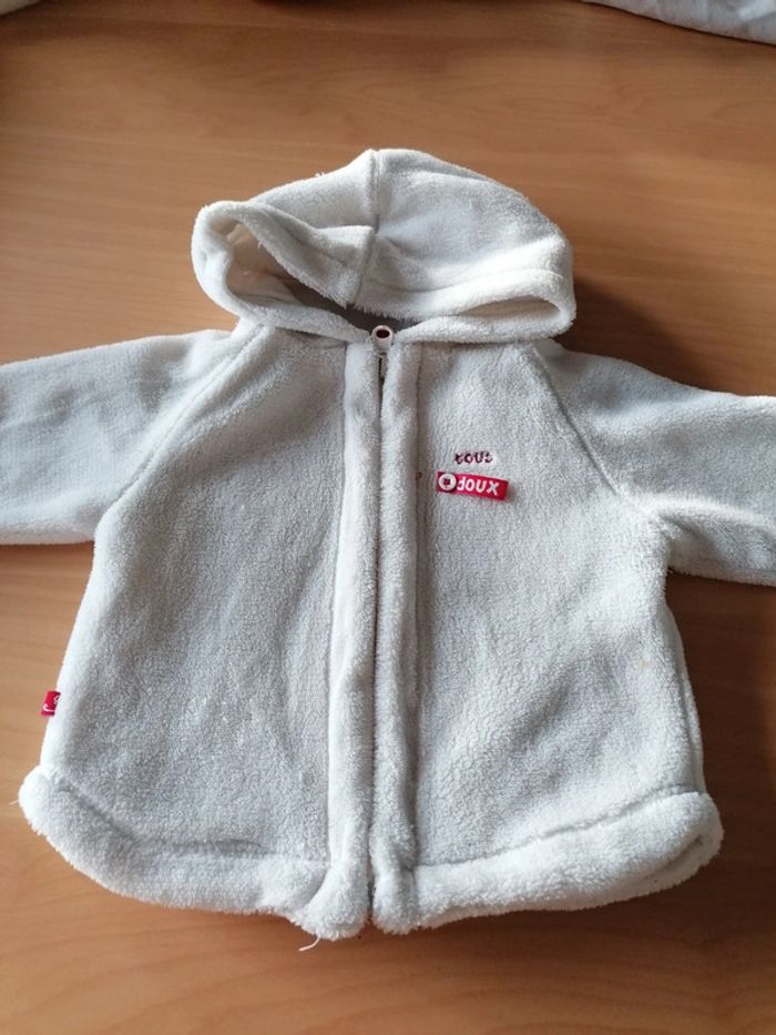 Bonjour, je vends cette veste en polaire blanche à capuche de la marque babygro taille 6mois. Très bon état. Lavé maison non fumeur.