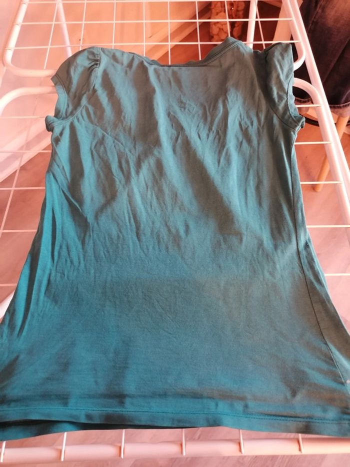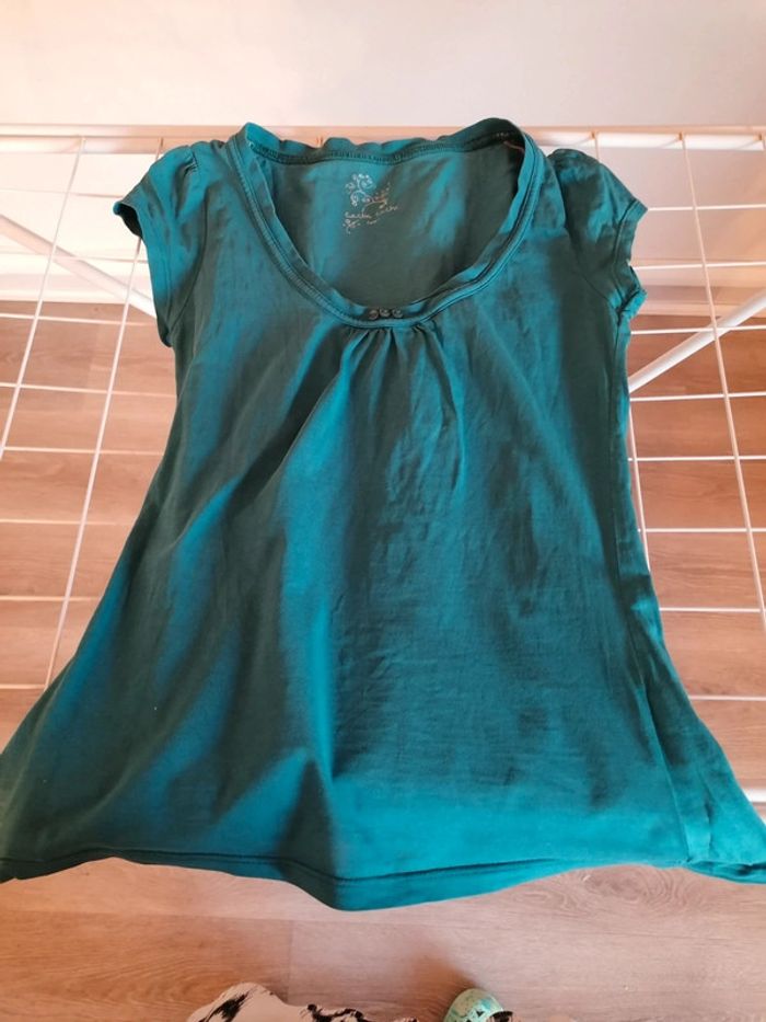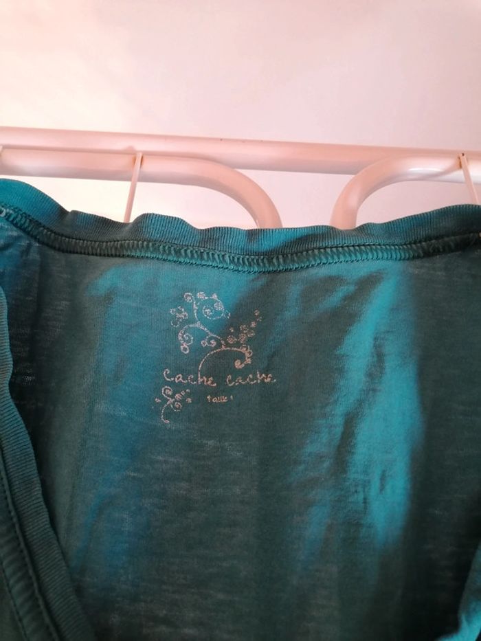 Bonjour, je vends ce tee shirt cache cache bleu/vert en parfait état. Taille 1. Lavé maison non fumeur.