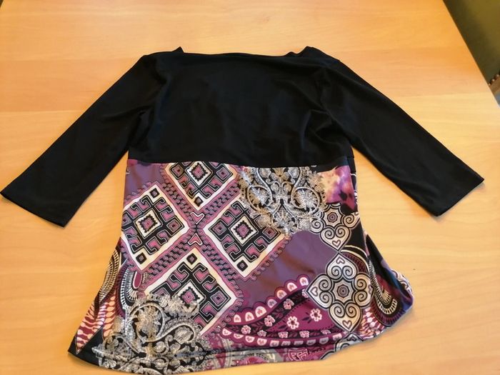 Bonjour, je vends ce tee shirt manches 3/4. Cache cœur sur la poitrine. Noir en haut et motifs violet en bas. Très bon état. Marque in extenso. Taille M.