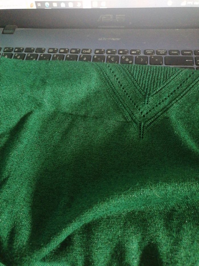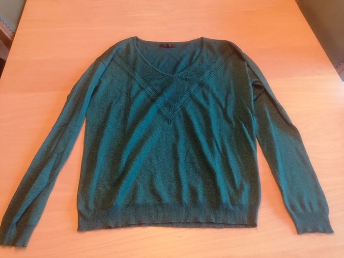 Bonjour, je vends ce pull léger de la marque la halle en bon état. Taille S. Vert un peu pailleté. Un fil à été tiré mais reste discret.