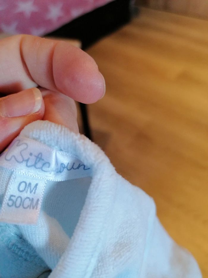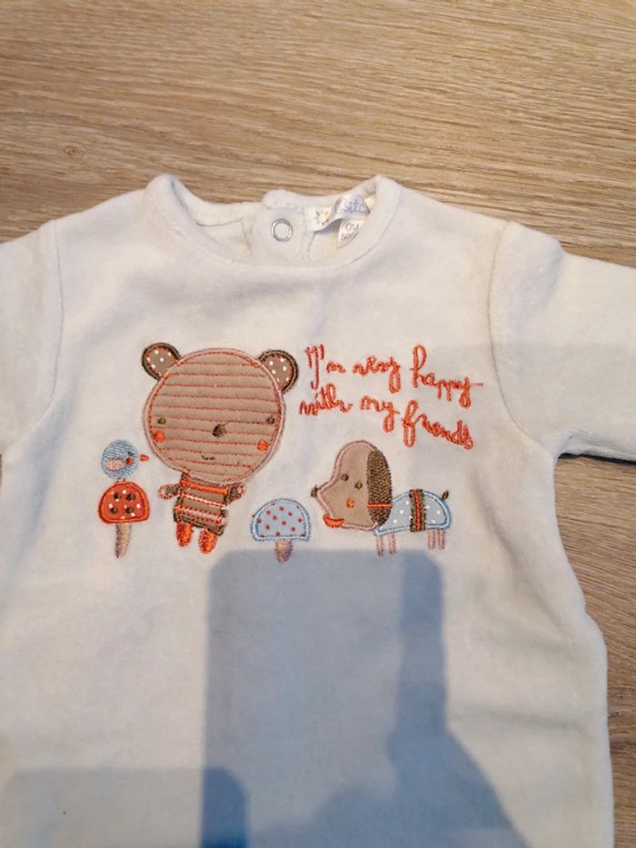 Bonjour, je vends ce babygros bleu ciel. Marque Kitchoun. Naissance. Matière velours.