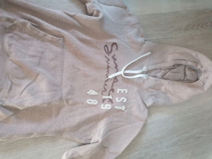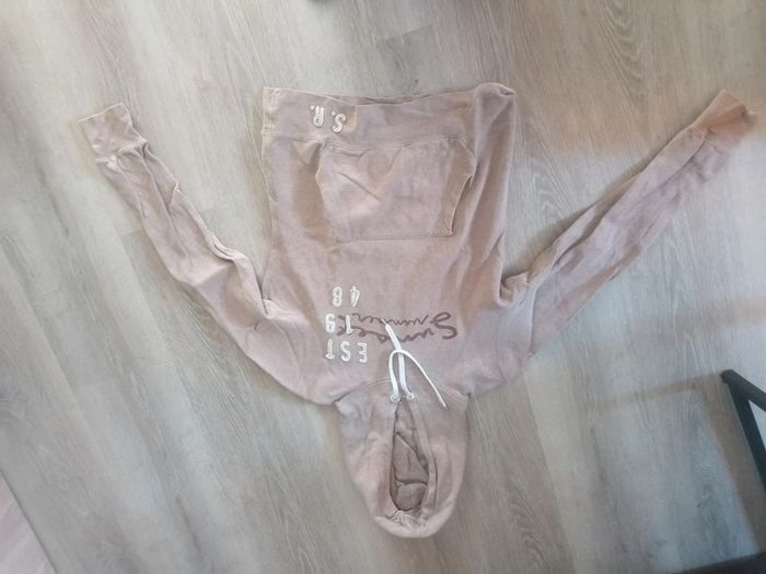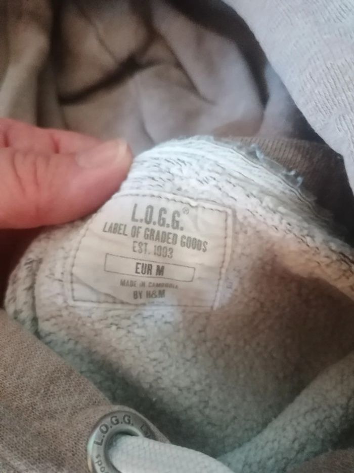 Bonjour, je vends ce sweat a capuche beige avec écriture. Cordon col. Marque LOGG. Taille M.
