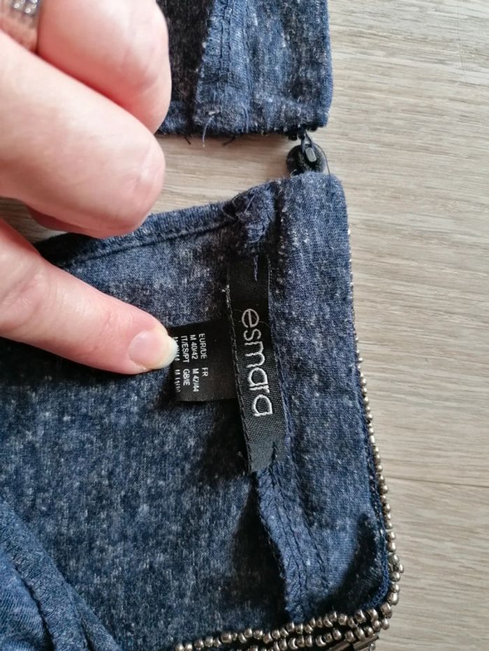 Bonjour, je vends ce tee shirt bleu/gris avec des perles brodées au niveau du col. Marque Esmara. Taille 40. Très bon état.