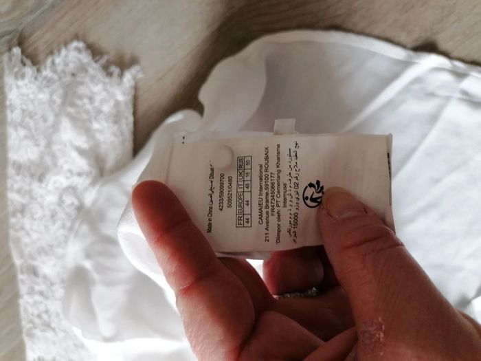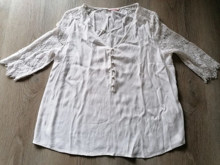 Bonjour, je vends ce tee shirt manches 3/4 blanc. Petit décolleté avec boutons entre la poitrine. Très bon état. Marque camaïeu, taille 44.