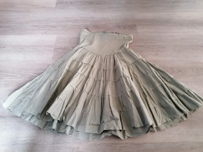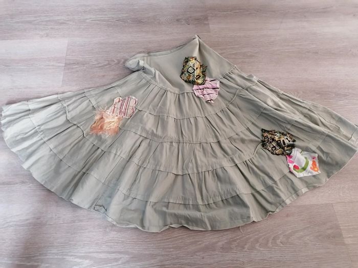 Bonjour, je vends cette jupe serrée à la taille et évasée. Broderies sur le devant. Fermeture éclair sur le côté. Très bon état. Lavé maison non fumeur.