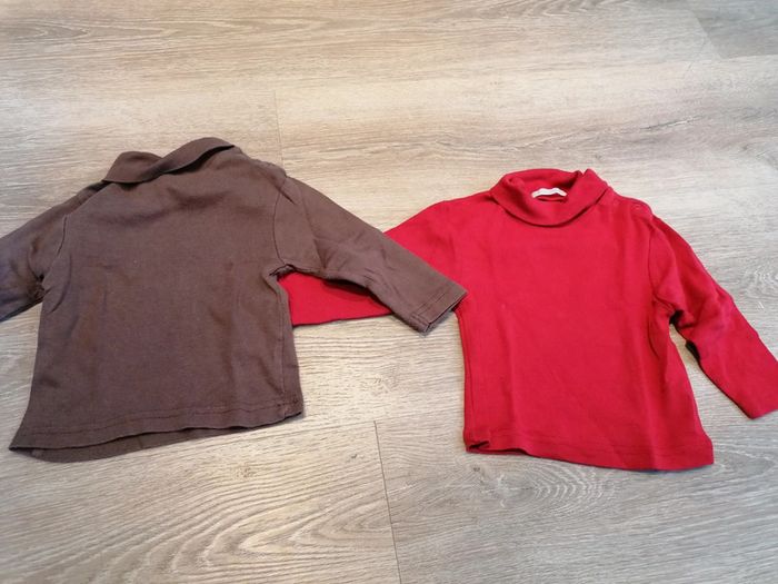 Bonjour, je vends ces 2 sous pulls col roulé la redoute rouge et marron. Pression sur l'épaule. Taille 18mois. Lavé maison non fumeur.