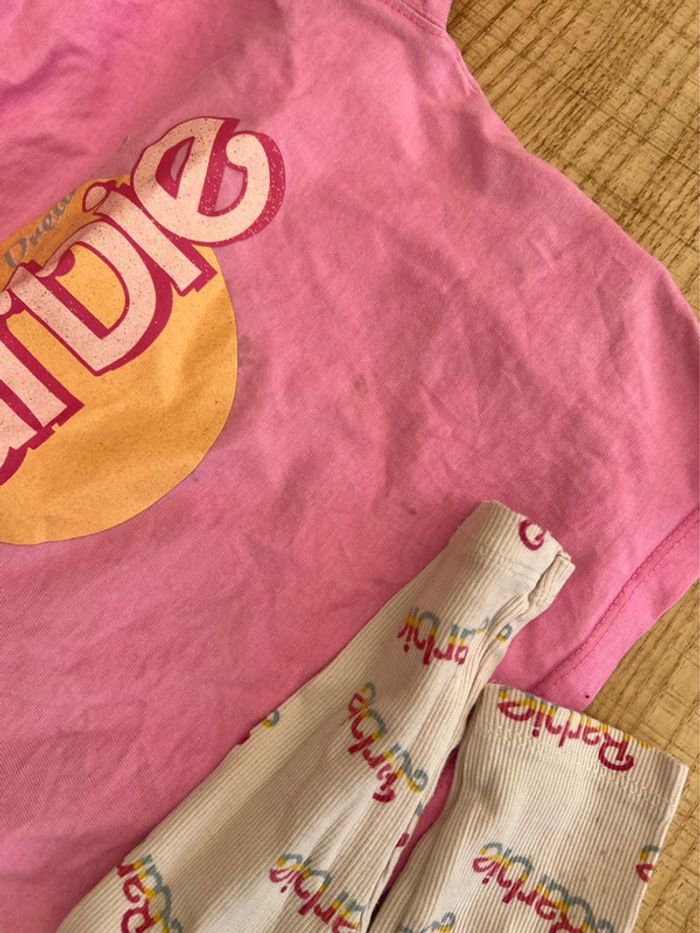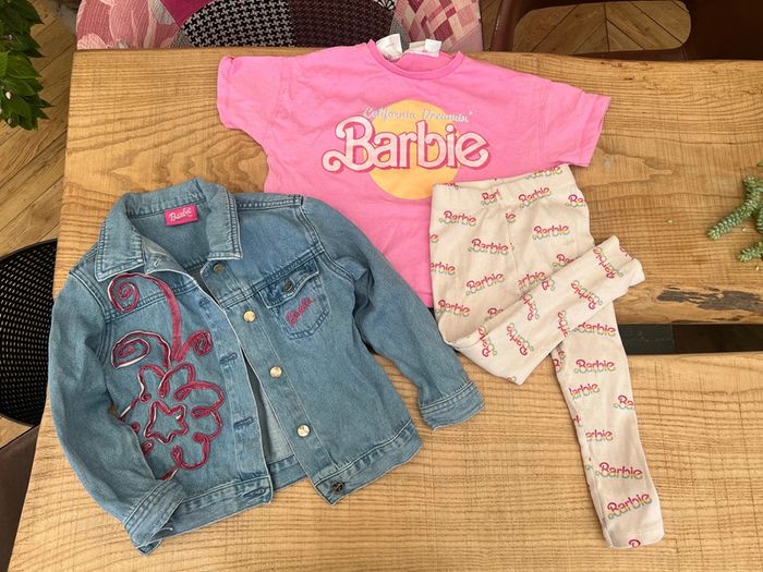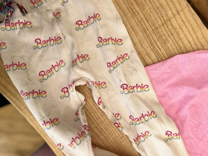Tenue fille barbie T-shirt et legging Zara 4 ans porté une fois mais ma fille a fait des bulles 🫧 😓 donc quelques taches discrètes voir deux dernières photos 🥺 Veste barbie 5 ans coupe loose Super sympa porté