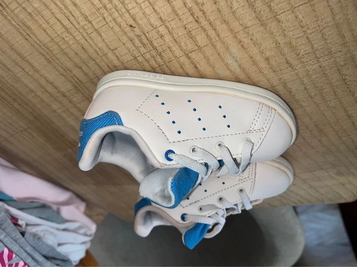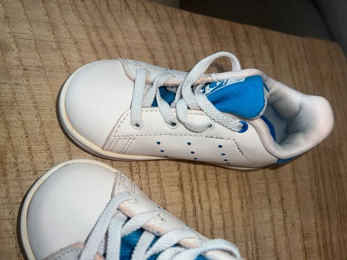 Chaussures Basket Stan Smith adidas bleu clair et blanche à lacets élastiques peu portées - photo numéro 1