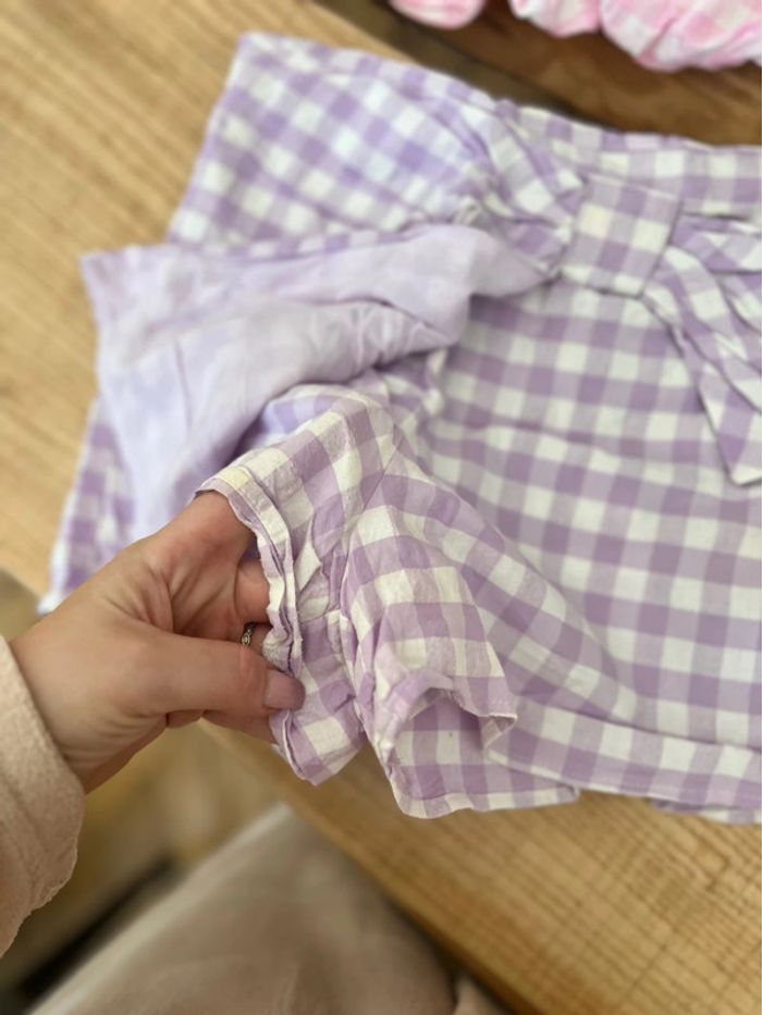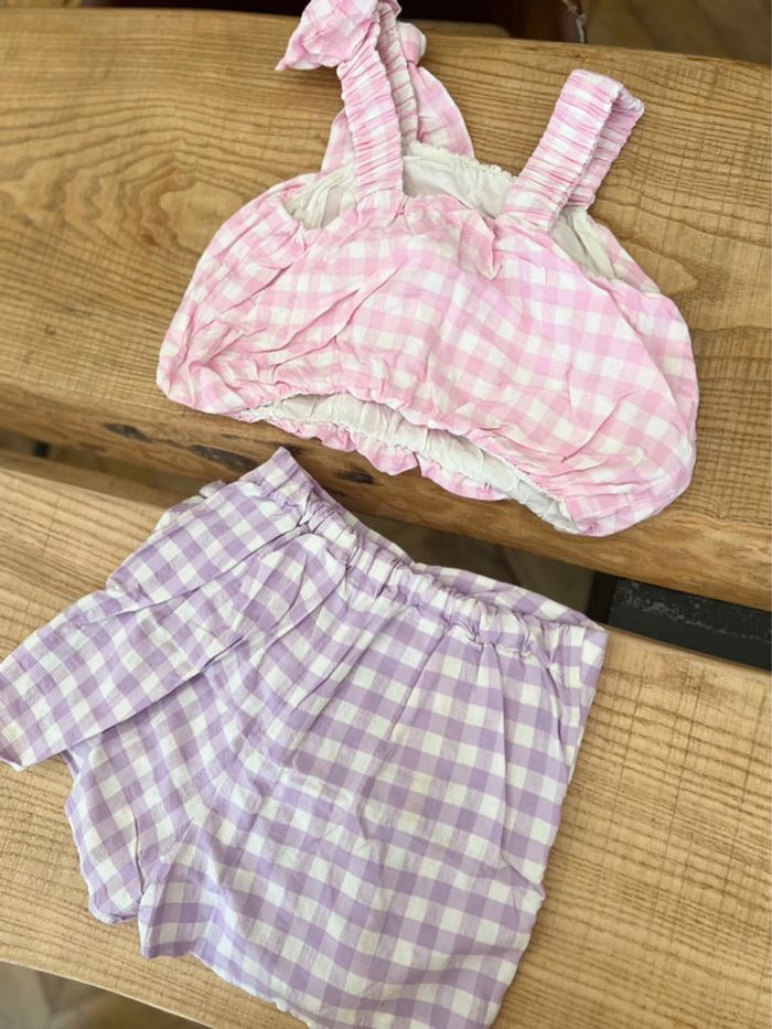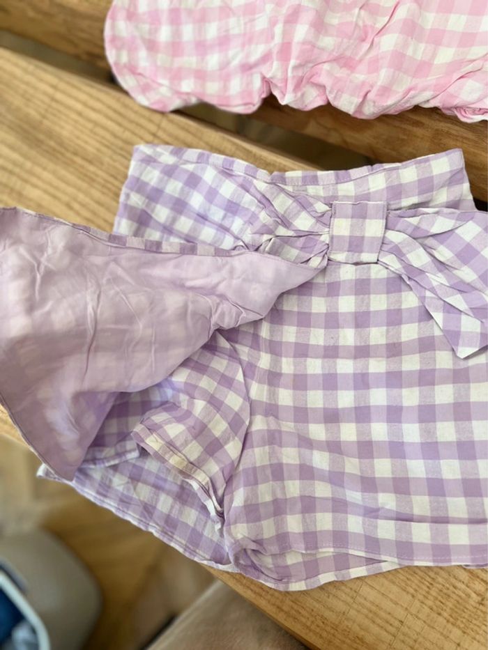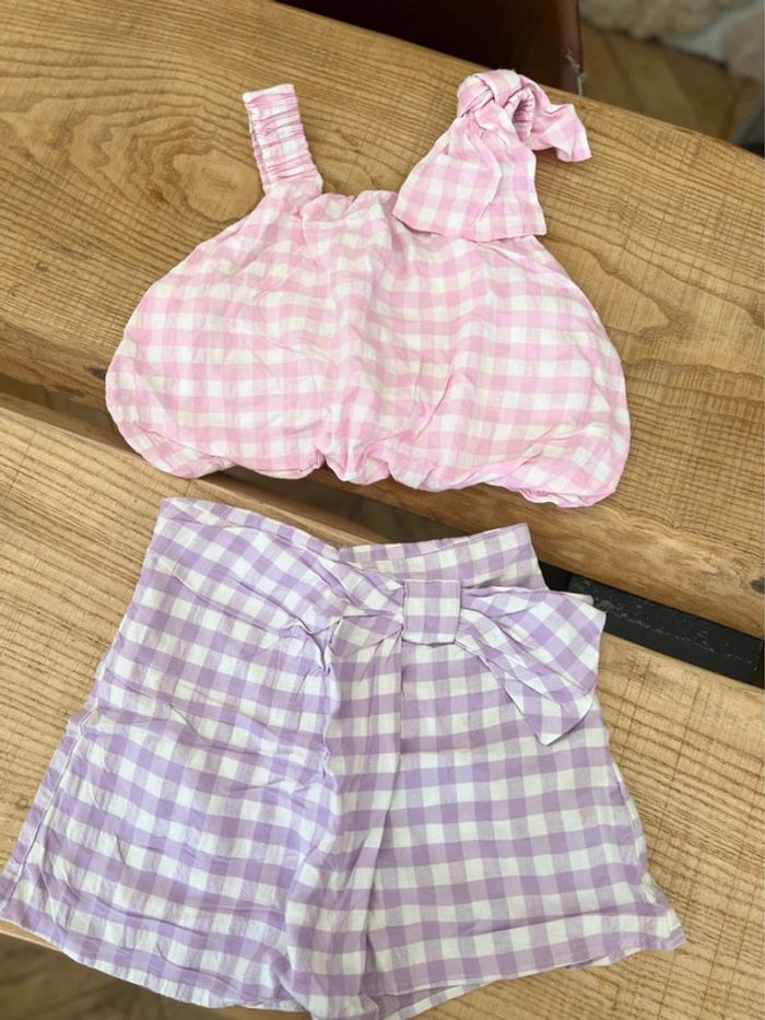 Superbe porte pour un look barbie ! Porté une seule fois Zara Taille 13 - 14 ans Débardeur avec une bretelle gros noeud Jupe short avec noeud À carreaux Vichy rose pale et Lila (parme)