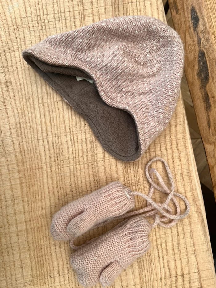 Ensemble bonnet et moufles hiver 2-3 ans Bonnet style péruvien doublé polaire marque mini a ture Moufle sans marque offertes Bien chaud Vieux rose
