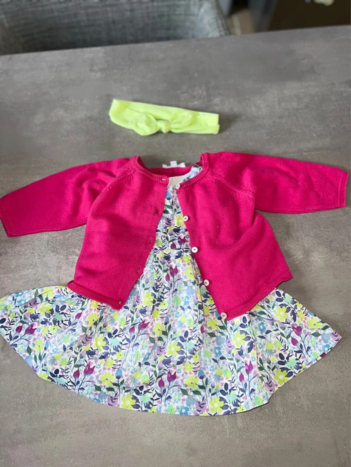 Ensemble 6 mois en très bon état Marque jacadi Robe dos nu en liberty Gilet rose fushia + bandeau sans marque réglable