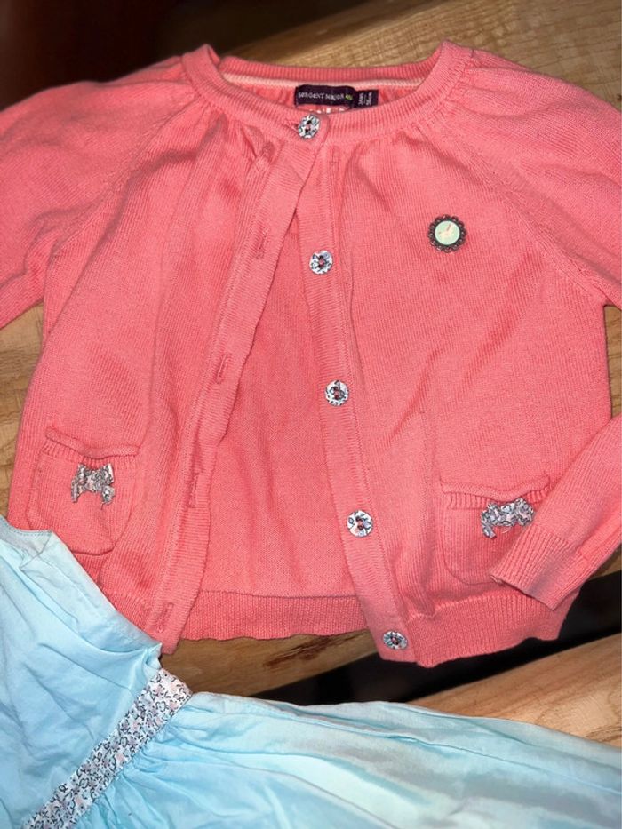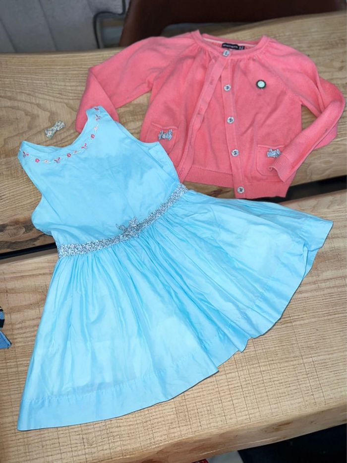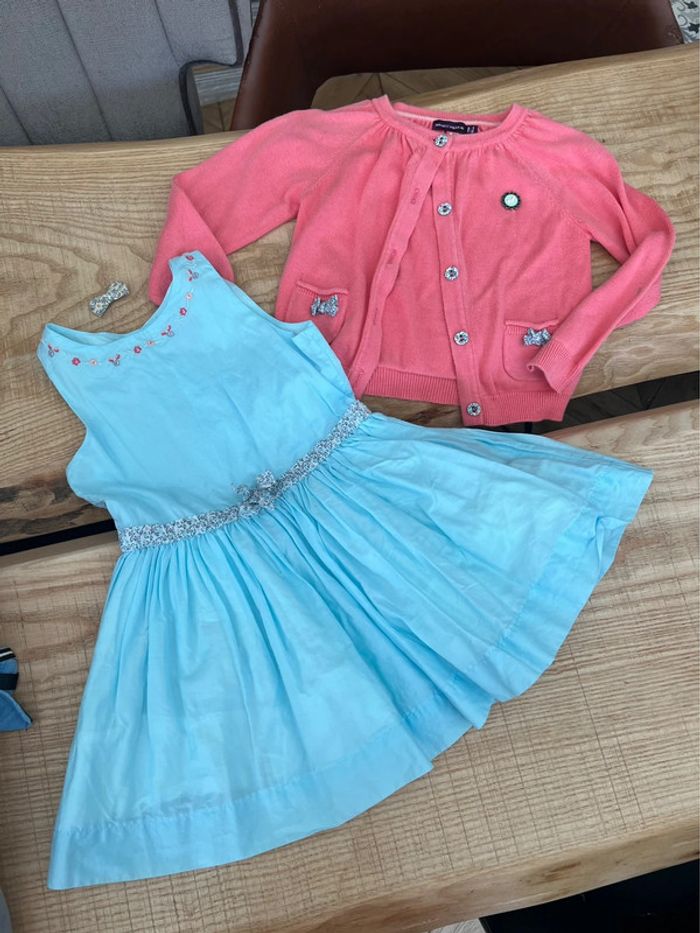 Ensemble Sergent Major 3 ans Gilet corail + robe turquoise Avec détails fleurs Liberty + barrette à cheveux En très bon état