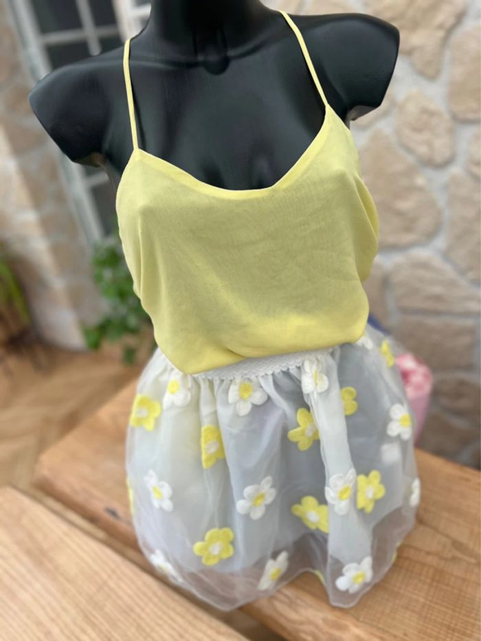 Ensemble d’été jaune jupe à fleurs débardeur voilage S&w 36 38 S M