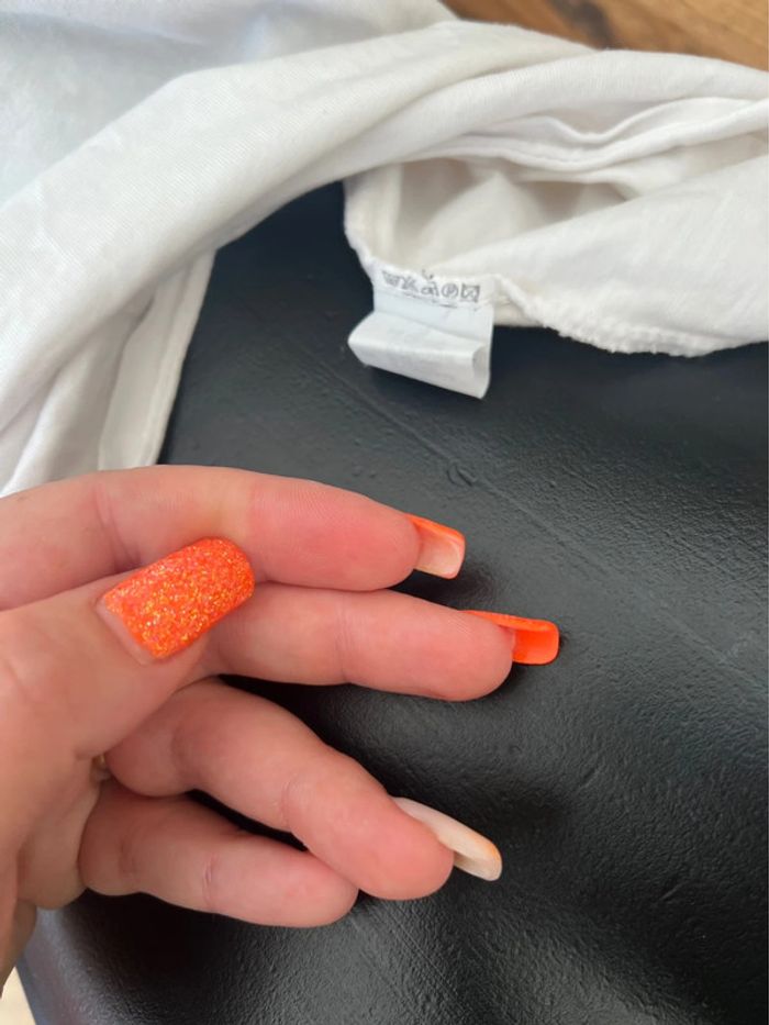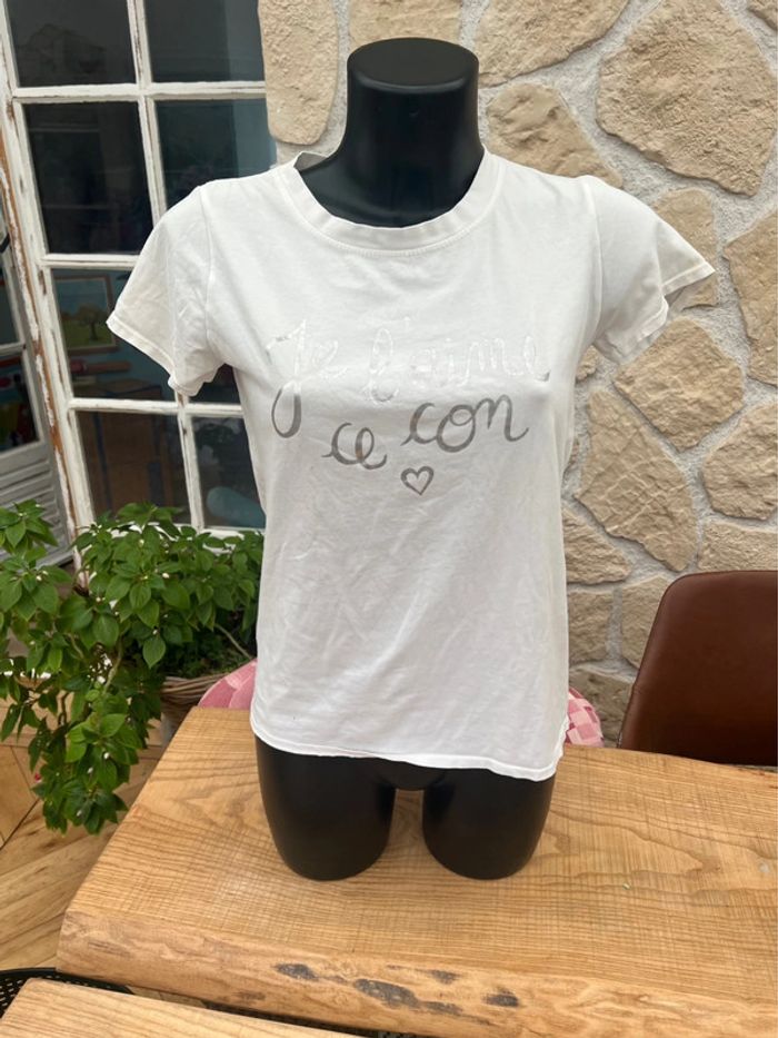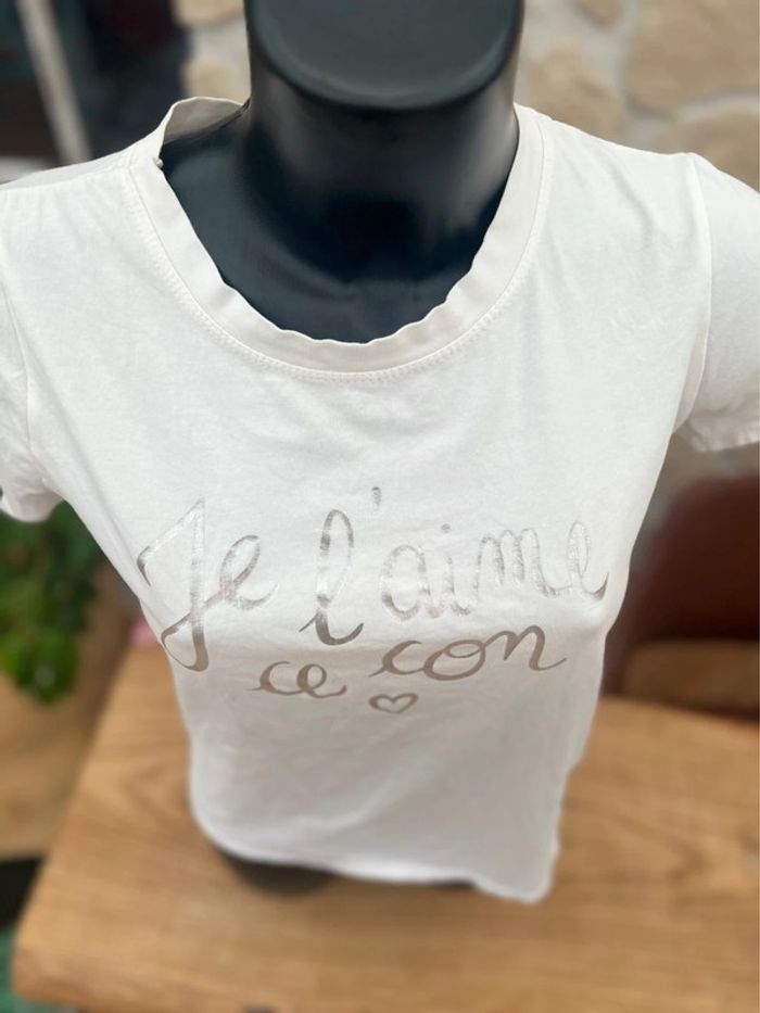 T-shirt manches courtes Marque made in italy Acheté 25€ en boutique indépendante Peu porté Blanc avec écrit en argenté « je l’aime ce con »