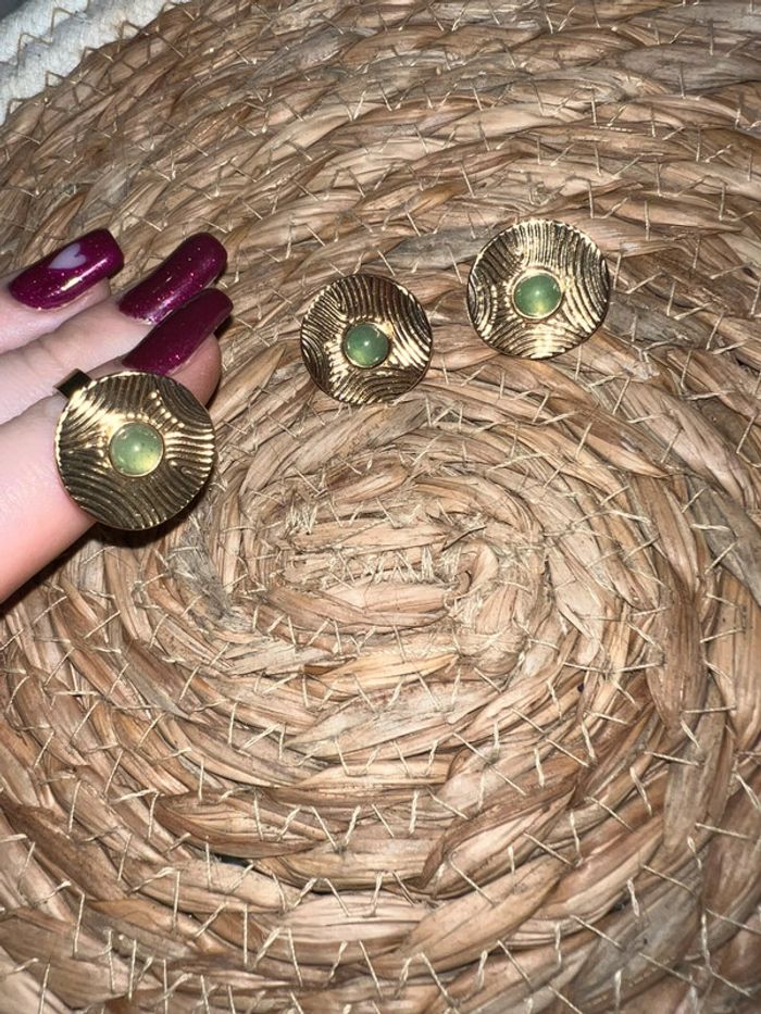 Ensemble parure bijoux doré vert kaki bague réglable bouche d’oreille - photo numéro 1