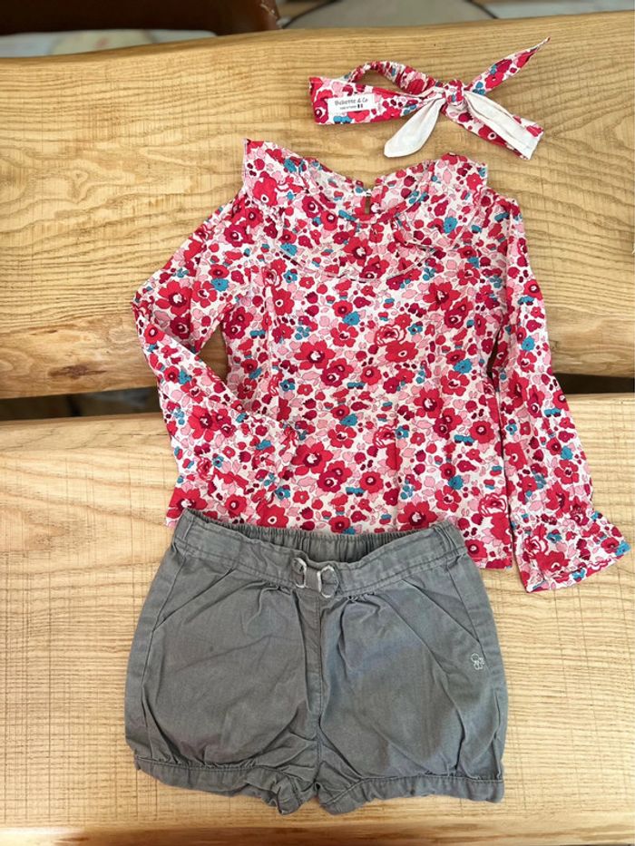 Ensemble en très bon état 36 mois Blouse et bandeau Liberty betsy cerise en très bon état (juste boutonnière de la blouse arrière reprise) créatrice bichette & co Short obaibi tbe Même Liberty que celui utilisé par Jacadi