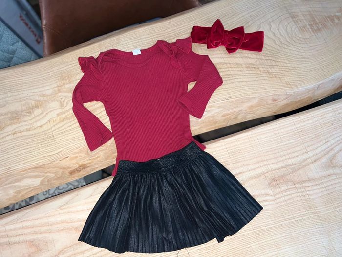 Ensemble 24 mois 2 ans jupe simili cuir noir plissée bandeau - photo numéro 1