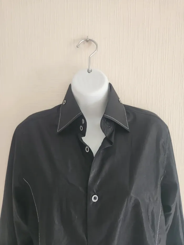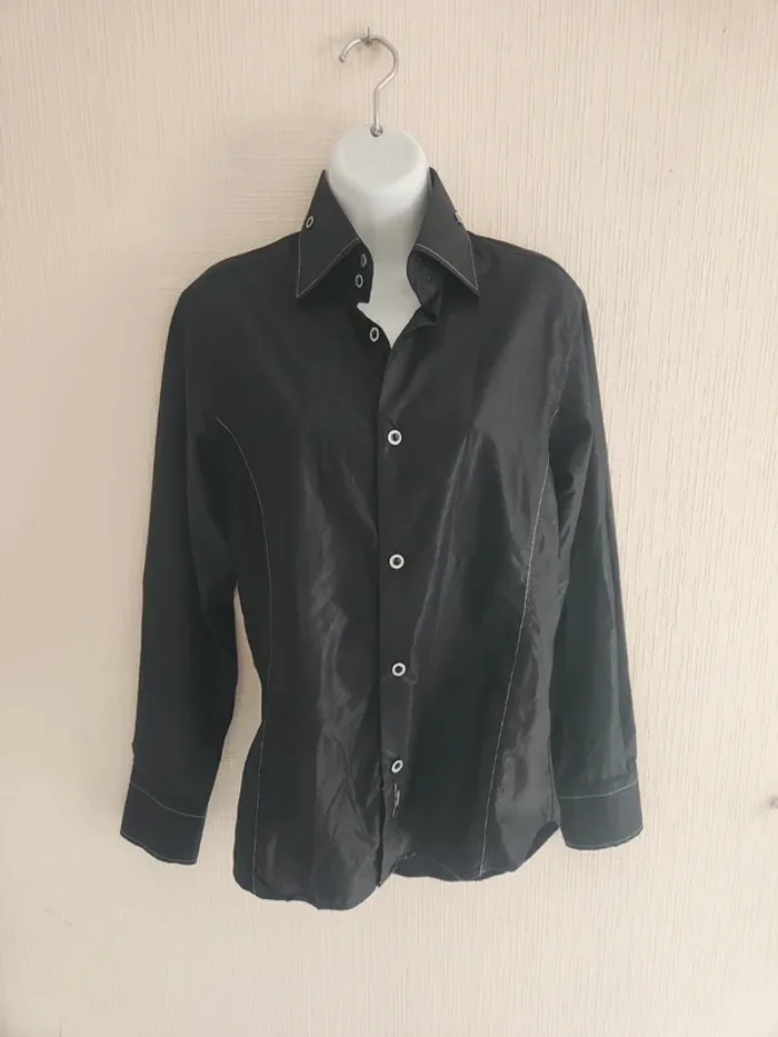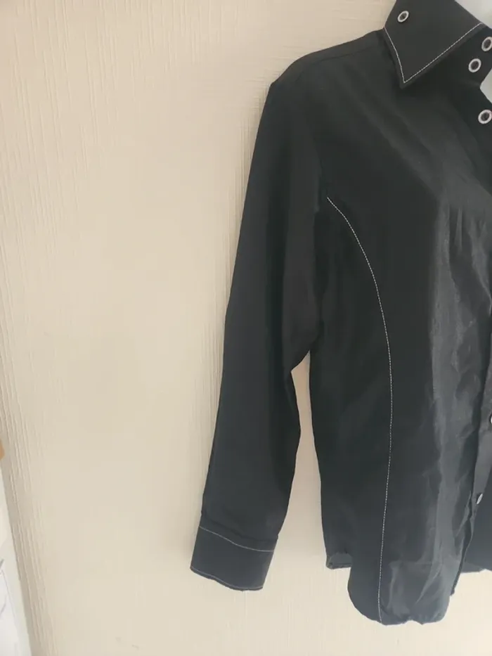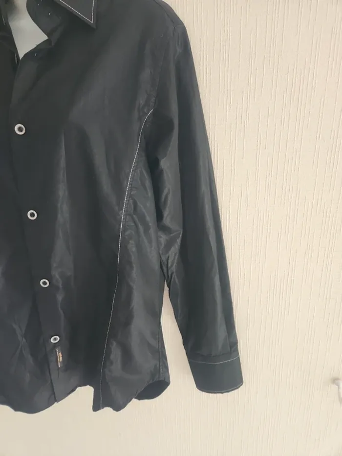 Chemise à manches longues noir effet brillant, marque M'rode, taille S. Les boutons sont de couleur argentée / pailleté