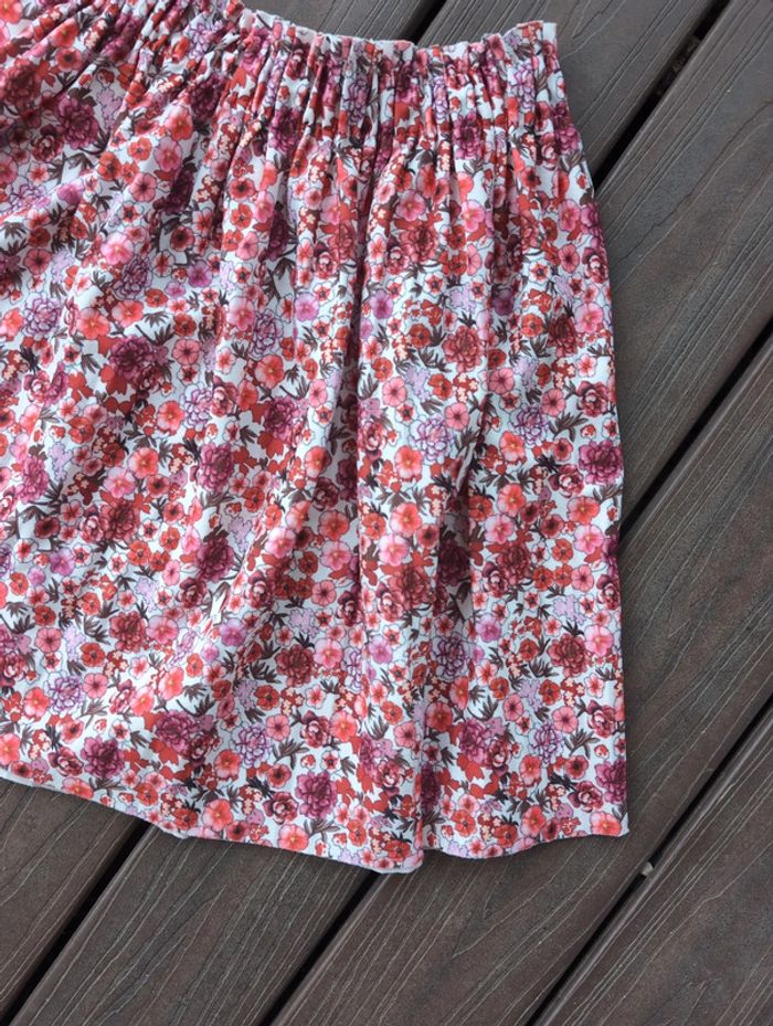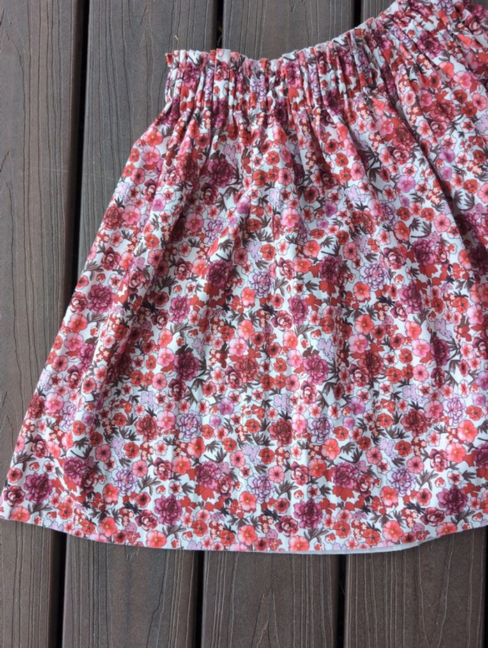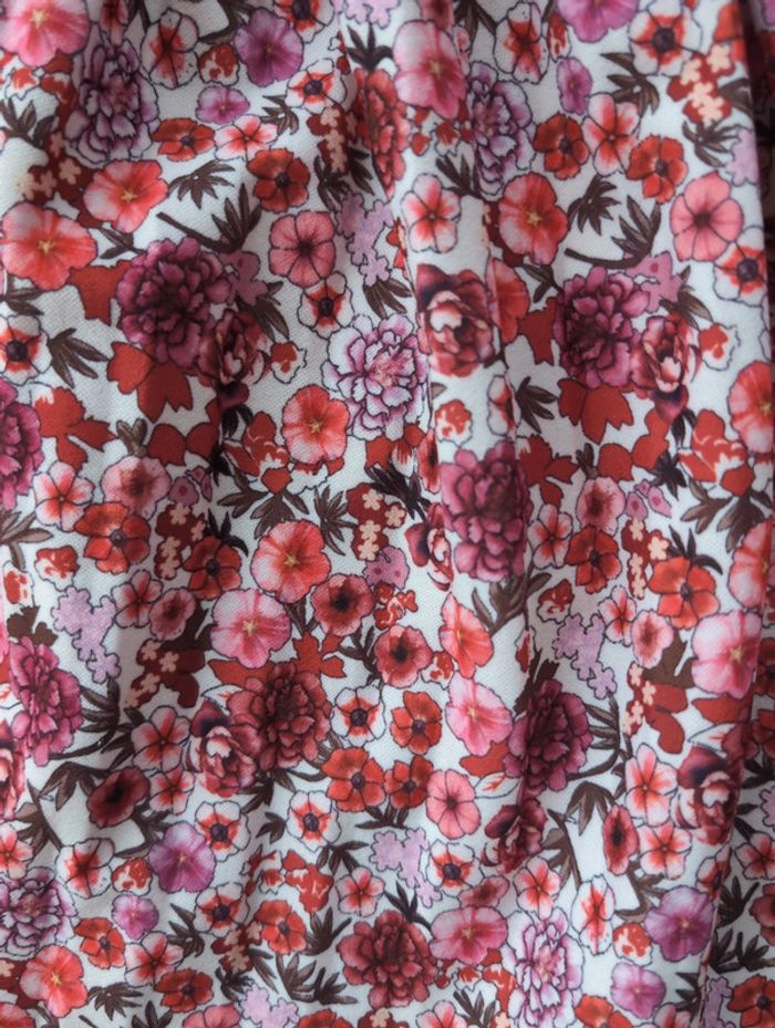 Magnifique petite jupe plissée motifs liberty fleuri. Rose/rouge sur fond blanc. Ceinture froncée élastique. Taille haute. Jamais portée