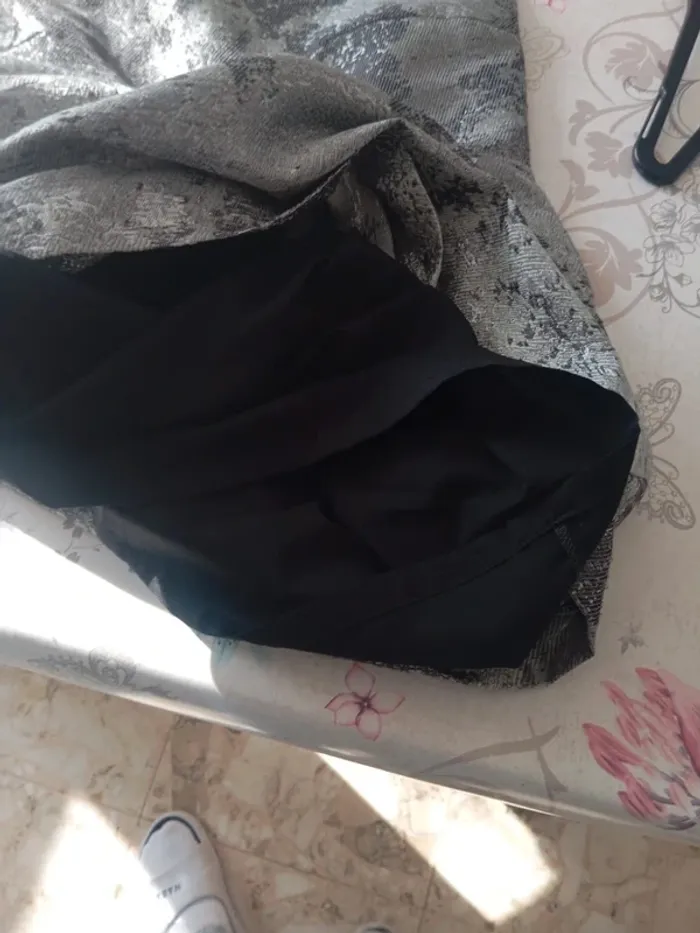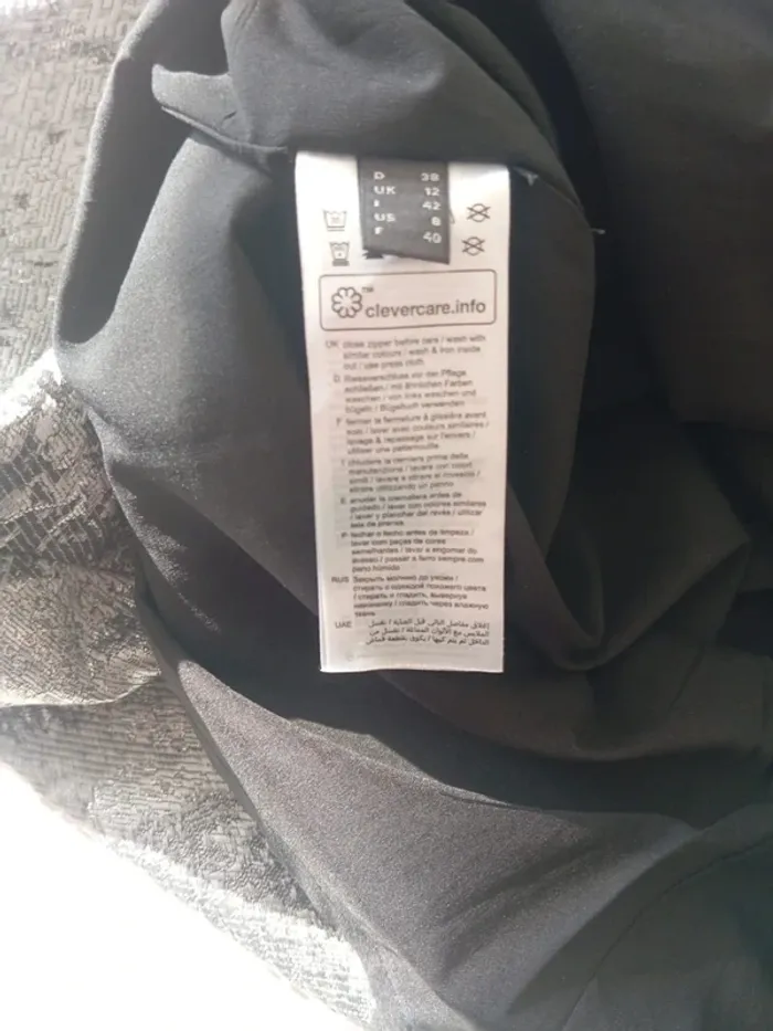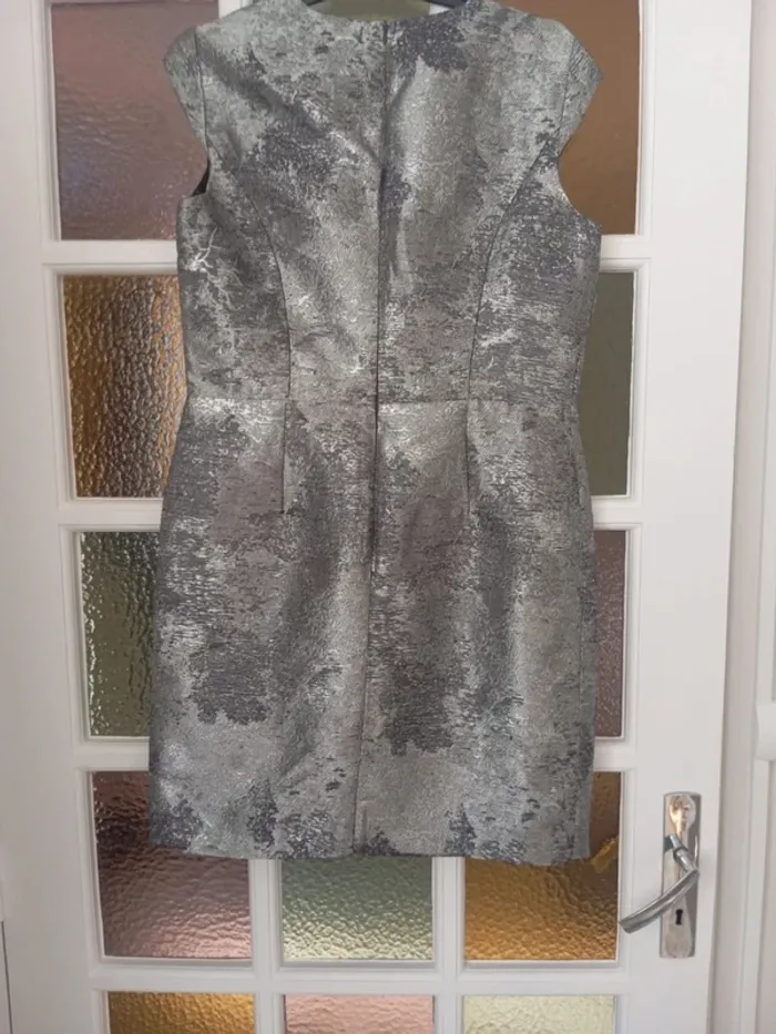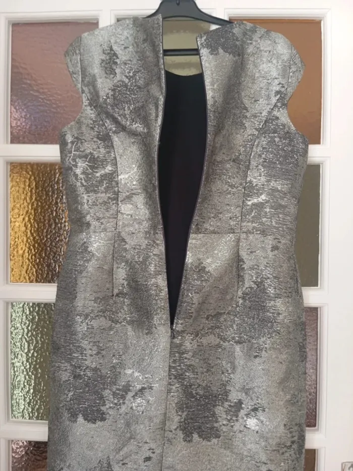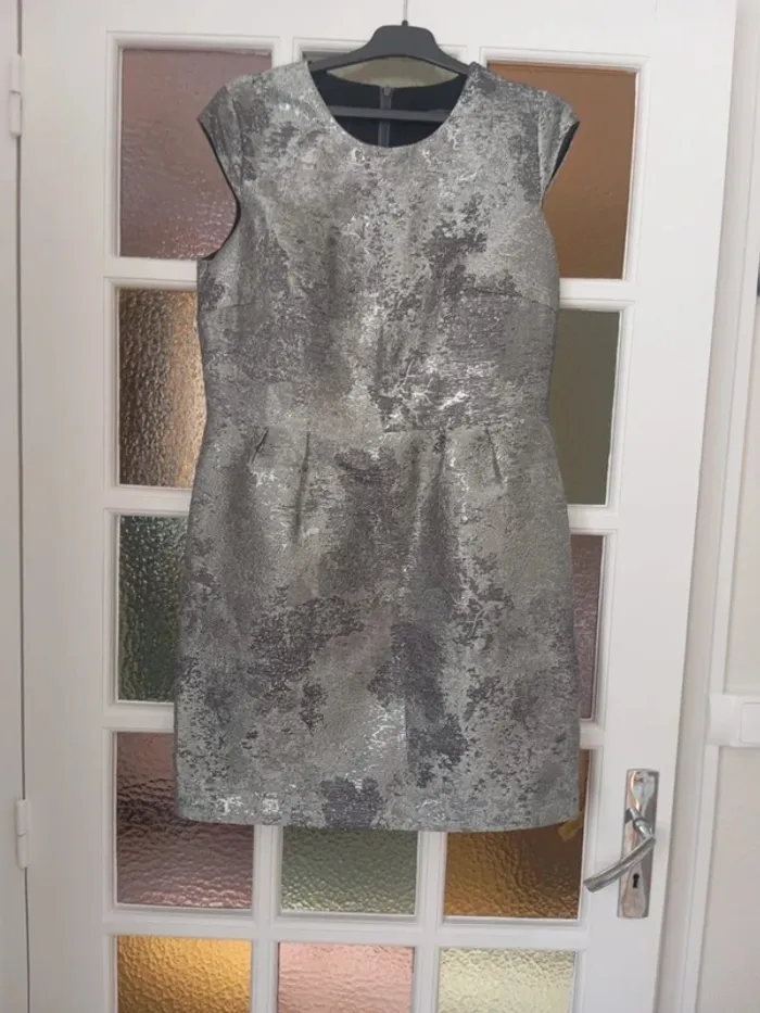 En très bon état Marque esprit Taille 40taille petit plutôt 38 Couleur argent noir Largeur épaule 37 cm Largeur sous de bras 48 cm Longueur 92 cm Doublé intérieur