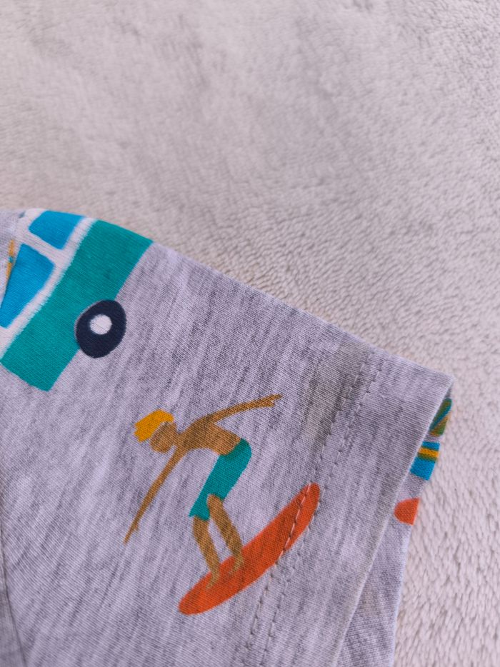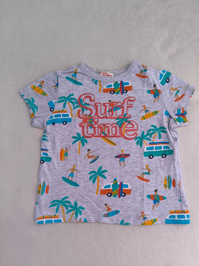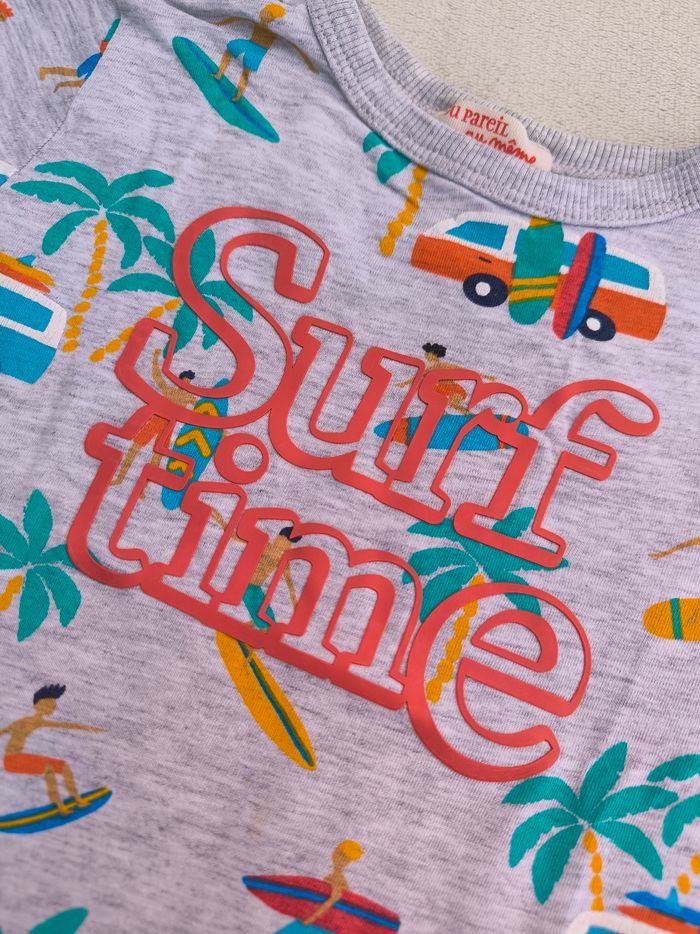 T-shirt à manches courtes Marque Du Pareil au même Taille 3 ans, 98 cm • Coloris gris, vert, jaune moutarde... • Inscription en texture "Surf time", imprimés palmiers, planche de surf, van... • Coton fin • Petites taches, imprimés qui craquellent En bon état #evelyne_garcons_3ans #evelyne_garcons