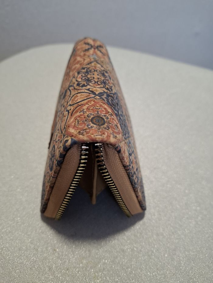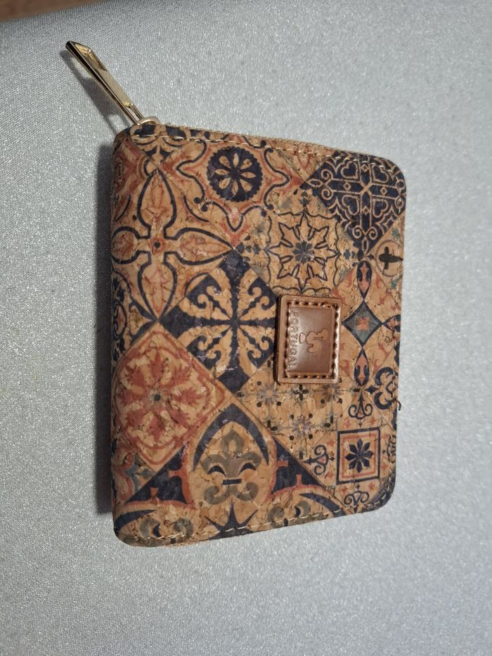Très beau porte-monnaie/cartes pour femme, en liège décoré avec volutes, écusson simili cuir marron "Portugal", zip doré, 7 compartiments intérieurs (6 pour cartes et 1 zippé pour monnaie, dimensions 12 x 9,5 x 3 cm et totalement neuf, jamais utilisé.